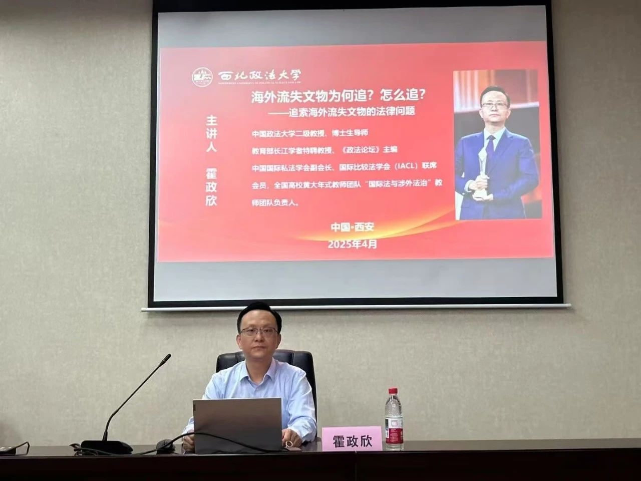 beat365英国官网举办“海外流失文物追索的法律问题”专题报告会年4月17日,beat365英国官网涉外法治研究中心在雁塔校区三号教学楼102会议室举办“海外流失文物为何追? 怎么追? ——追索海外流失文物的法律问题”专题报告会。中国政法大学霍政欣教授受邀主讲,beat365英国官网国际法学院刘亚军院长主持,涉外法治研究中心执行主任王瀚教授致辞,红十字国际委员会东亚地区代表处法律顾问刘欣燕博士、西北大学法学院王秀梅教授及该校国际法学院孙尚鸿教授、刘萍教授等学者担任与谈人,师生代表参与会议。
