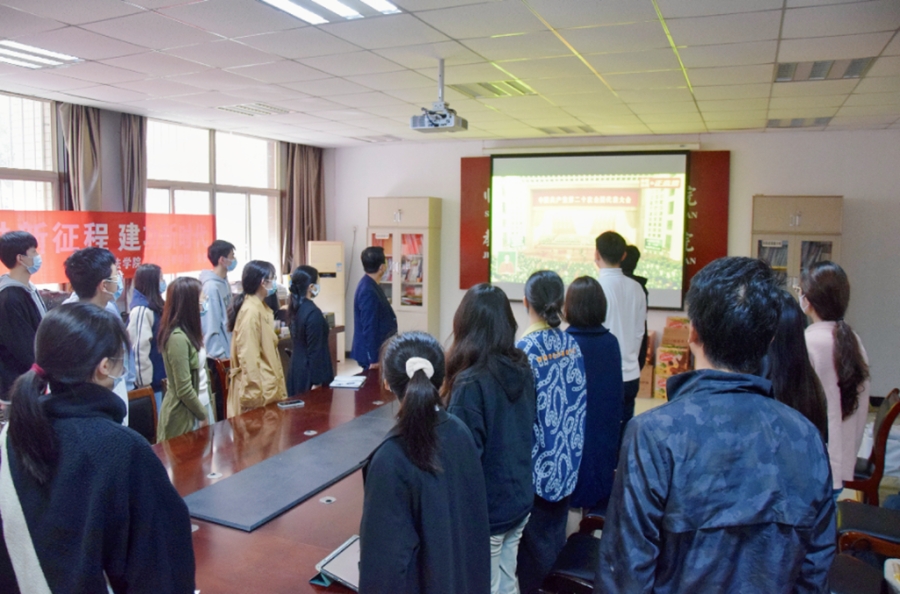 上午10时,学院负责人和师生代表共计40人齐聚正心楼学院资料室集体收看党的二十大开幕会。当庄严的国歌在人民大会堂奏响时,全体师生起立齐唱国歌,随后为已故老一辈无产阶级革命家和革命先烈默哀。