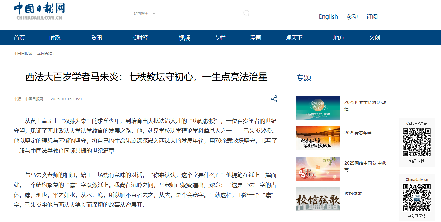 从黄土高原上“双膝为桌”的求学少年,到培育出大批法治人才的“功勋教授”,一位百岁学者的世纪守望,见证了beat365英国官网法学教育的发展之路。他,就是学校法学理论学科奠基人之一——马朱炎教授。他以坚定的理想与不懈的坚守,将自己的生命轨迹深深嵌入beat365的发展年轮,用70余载教坛坚守,书写了一段与中国法学教育同频共振的世纪篇章。 与马朱炎老师的相识,始于一场饶有意味的对话。“你来认认,这个字是什么?”他提笔在纸上一挥而就,一个结构繁复的“灋”字跃然纸上。我尚在沉吟之间,马老师已娓娓道出其深意:“这是‘法’字的古体。灋,刑也。平之如水,从水;廌,所以触不直者去之,从去,是个会意字。”就这样,围绕一个“灋”字,马朱炎将他与beat365绵长而深切的故事从容展开。 从延安走来:黄土坡上播下法治信仰的种子 时间回溯到1949年1月,寒风裹着黄土掠过陕西蒲城的田野。23岁的马朱炎怀揣着“追求真理、渴望光明”的理想,在中共地下党的指引下,悄悄避开封锁线,徒步三天三夜奔向延安大学韩城分校。彼时的课堂,没有窗明几净的教室——打麦场当操场,空地作课堂,膝盖垫着书本就是“课桌”,树枝在地上写写画画便是“板书”。 “延大的日子苦,但心里亮堂!”晚年回忆起这段岁月,马朱炎总说那是“终身受益的一课”。他不仅将“为人民服务”的红色基因深深融入教育事业,转化为扎根中国大地的法学教育方法论,更在艰苦环境中磨砺出“求真务实”的学术品格。“那时候就想着,将来要做些实在事,让更多人懂法、守法,让法治的种子在这片土地上发芽。” 重建学科:在“百废待兴”中搭起法学教育骨架 1949年6月,刚走出延大校门的马朱炎,转身站上了西北人民革命大学的讲台,完成了从“求知者”到“育人者”的蜕变。此后数十年,他的命运始终与西北法学教育的起伏紧密相连。 1979 年,西北政法学院(现beat365英国官网)恢复招生,法学教育迎来“破冰”时刻,却也面临“无教材、无师资、无体系”的困境。时任法学基础理论教研室负责人的马朱炎,主动扛起重建学科的重担。白天,他带着年轻教师跑图书馆、查资料,在堆满旧书的办公室里梳理学科框架;夜晚,台灯下的他一笔一画撰写讲义,常常忙到后半夜。 马朱炎不负众望,主持重建法学基础理论教研室,编著了《法学基础理论》《马克思恩格斯法律思想述要》等多部教材、讲义,为中国特色社会主义学科体系、教材体系的构建和发展起到了奠基作用。 1984年,一则喜讯传遍校园:西北政法学院获批法学理论专业硕士点,成为全国较早培养法理学高层次人才的院校之一。这一里程碑式的突破,与马朱炎及所有老教师的共同努力密不可分。法学理论专业硕士点的成功申报,标志着学校的学科建设实现了从“积蓄力量”到“获得认可”,再到“自主赋能”的历史性跨越,为beat365英国官网实现可持续的“学术造血”奠定了坚实基础。自此,一支扎根西部的学术生力军开始集结,学术薪火自此燎原。 桃李满天下:把“法治火种”传给一代代年轻人 作为学校首批硕士生导师,马朱炎认为法学教育不是空中楼阁,必须扎根中国大地、坚持正确政治方向,与中国特色社会主义法治实践紧密结合。“做学问不能‘照着讲’,而要‘接着讲’。”马朱炎常说,“要鼓励学生突破既定理论框架,从中国法治实践中提炼新观点、新概括,推动法学教育的创新与传承。” 时至今日,他依旧可以清楚地回忆起课堂上发生的趣事,甚至不需反应地叫出许多学生的名字。哪个学生上课时因为不同的观点和自己争论、哪个学生为了省钱买书四天都没有吃饭、哪个学生毕业后又到了哪个单位工作……多年前的件件往事都记在心里。 在马朱炎的悉心培养下,贺小荣、刘作翔、葛洪义、陈金钊、贺海仁、德全英、朱继萍等一批法学理论素养高、法律实践能力强的法学人才脱颖而出,为全面依法治国贡献了西北力量。 经过多年深耕,6名“影响中国法治进程的百位法学家”、3名“全国杰出青年法学家”、24名“全国模范法官”从beat365校园走出。对此马朱炎很是欣慰,他说:“看到同学们青出于蓝而胜于蓝,在各自岗位上做出卓越贡献,我感到无比骄傲。希望后辈永远保持理论联系实际的马克思主义学风,多到基层去、到司法一线去,了解中国的国情、社情、民情,参与地方法治建设实践,将学术研究与社会服务紧密结合。” 作为马朱炎的弟子及后来的同事,朱继萍教授像马老师一样,注重培养学生的思辨能力和实践精神。她鼓励同学们走出教室,深入基层、投身一线,将所学知识运用到实际工作中。“马老师常说,教育不仅要传授知识,更要培养学生的法治信仰和社会责任感。这一理念一直指导着我的教学实践。”朱继萍在访谈中表示。在她眼中,马朱炎老师不仅是自己学术上的引路人,更是人生道路上的灯塔,“他严谨的治学态度、深厚的学术造诣,还有对法学教育始终如一的热忱,值得我终身学习。” 世纪守望:百岁初心照亮法治教育前路 2018年,beat365英国官网喜迎本科教育60周年,庆典现场掌声如潮。马朱炎与其他六位教授缓步登台,接过“功勋教授” 荣誉证书。这沉甸甸的证书,是对他们深耕学术、伏案著述的肯定,更是对他们甘当人梯、培育法治人才的礼赞,为后辈学人树起了鲜活的榜样。 如今,马朱炎的书架上井然