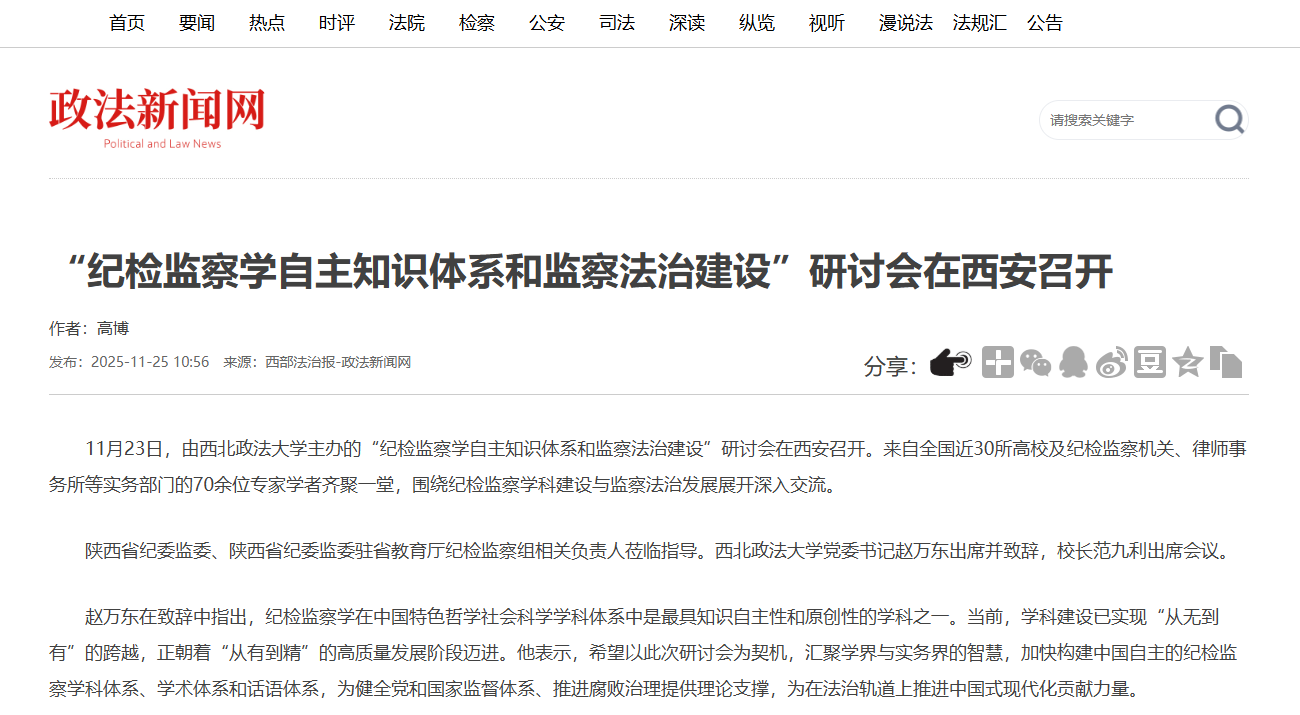 【政法新闻网】“纪检监察学自主知识体系和监察法治建设”研讨会在西安召开 https://www.xbfzb.com/2025-11/25/content_11424278.html 【中国日报网】“纪检监察学自主知识体系和监察法治建设”研讨会在西安召开https://shx.chinadaily.com.cn/a/202511/25/WS69251ebaa310942cc499328a.html 【科学网】“纪检监察学自主知识体系和监察法治建设”研讨会在西安召开https://news.sciencenet.cn/htmlnews/2025/11/555840.shtm 【陕西农村网】“纪检监察学自主知识体系和监察法治建设”研讨会在西安召开 https://www.sxncb.com/2025-11/25/content_11424911.html 【秦风】“纪检监察学自主知识体系和监察法治建设”研讨会在西安召开https://qinwen.sanqin.com/app/template/displayTemplate/news/newsDetail/7130/11424909.html?isShare=true 【三秦网】“纪检监察学自主知识体系和监察法治建设”研讨会在西安召开https://www.sanqin.com/2025-11/25/content_11424907.html 【群众新闻】“纪检监察学自主知识体系和监察法治建设”研讨会在西安召开https://xzzsx.sxdaily.com.cn/app/template/displayTemplate/news/newsDetail/7357/11424937.html?isShare=true 【西部网】“纪检监察学自主知识体系和监察法治建设”研讨会在西安召开http://m.cnwest.com/jyzx/a/2025/11/25/23243603.html 【人民日报全媒体】“纪检监察学自主知识体系和监察法治建设”研讨会在西安召开 https://www.msweekly.com/mobile/show.html?id=178476 【中华网】“纪检监察学自主知识体系和监察法治建设”研讨会在西安召开https://m.business.china.com/toutiao/13004642/20251125/49020520.html