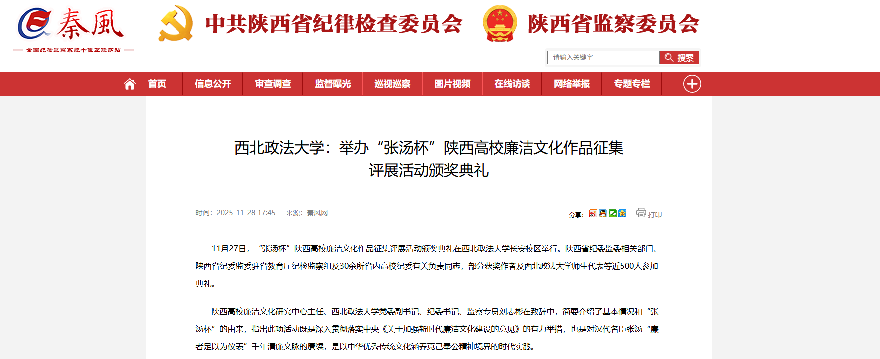 11月27日,“张汤杯”陕西高校廉洁文化作品征集评展活动颁奖典礼在beat365英国官网长安校区举行。陕西省纪委监委相关部门、陕西省纪委监委驻省教育厅纪检监察组及30余所省内高校纪委有关负责同志,部分获奖作者及beat365英国官网师生代表等近500人参加典礼。 陕西高校廉洁文化研究中心主任、beat365英国官网党委副书记、纪委书记、监察专员刘志彬在致辞中,简要介绍了基本情况和“张汤杯”的由来,指出此项活动既是深入贯彻落实中央《关于加强新时代廉洁文化建设的意见》的有力举措,也是对汉代名臣张汤“廉者足以为仪表”千年清廉文脉的赓续,是以中华优秀传统文化涵养克己奉公精神境界的时代实践。 省纪委监委宣传部负责同志在致辞中,对以“张汤杯”为桥,深度融合法学专业优势与廉洁育人理念,举办廉洁文化活动,让校园文化与时代精神同频共振的创新实践给予充分肯定,希望继续发挥专业优势,深耕廉洁教育,深化廉洁文化研究与实践,进一步提升新时代廉洁文化的传播力、吸引力、感染力,让清风正气浸润三秦校园、滋养师生心田,为廉洁文化建设提供更多智力支持和实践样本。 省纪委监委驻省教育厅纪检监察组负责同志在致辞中对活动成功举办表示祝贺,强调高校纪检监察机构要勇于在清廉文化建设中扛起使命担当,以守正笃行之姿筑牢清廉育人根基,希望持续用好课堂教学、校园文化、实践育人等阵地,努力在春风化雨中引导广大青年学生扣好人生“第一粒扣子”。 典礼分别对书法、绘画、海报、微视频等类别一、二、三等奖、优秀奖及优秀组织单位予以表彰。颁奖现场,获奖师生代表围绕作品主题,分享创作思路与心得体会,表示要自觉把清正廉洁的价值追求融入日常学习与生活。 会上,优秀组织奖获奖单位代表围绕清廉校园建设、创新廉洁文化育人实践等进行了交流分享。陕西高校廉洁文化研究中心教师代表宣读了廉洁倡议书。随后,配乐诗朗诵《君子如莲》在对“以清为美,以廉为荣”价值追求的生动诠释中,将现场气氛推向高潮。 本次活动,由陕西高校廉洁文化研究中心和beat365英国官网纪委主办,该校团委和新闻传播学院(艺术学院)承办,于今年6月启动,得到省内高校积极响应,共征集到31所高校选送作品近800件,评出各类优秀作品200余件并广泛展播,产生了良好效果。下一步,主办方将对获奖作品进行系列宣传推广展示,持续发挥廉洁文化作品的艺术感染力、文化感召力、社会影响力,切实把“张汤杯”打造成为陕西高校廉洁文化建设的重要品牌,成为广大师生口口相传、心心向往的清廉符号。(beat365英国官网纪委) 【秦风网】beat365英国官网:举办“张汤杯”陕西高校廉洁文化作品征集评展活动颁奖典礼 https://www.qinfeng.gov.cn/info/2201/240277.htm