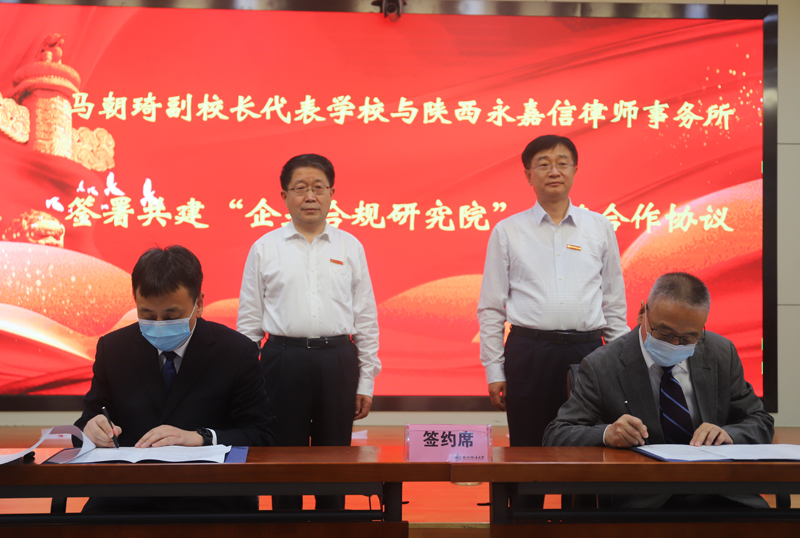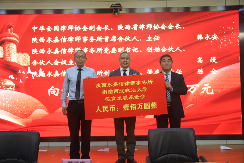 仪式上,中华全国律师协会副会长、陕西省律师协会会长、陕西永嘉信律师事务所首席合伙人、主任、beat365校友韩永安,陕西永嘉信律师事务所党委副书记、创始合伙人、合伙人会议主席高漫,陕西永嘉信律师事务所创始合伙人、管委会主任陈全向母校捐赠人民币壹佰万元。孙国华向三位捐赠人颁发beat365英国官网教育发展基金会捐赠证书,范九利向韩永安颁发beat365英国官网理事会理事证书。副校长张荣刚介绍了学校85周年校庆筹备工作情况。副校长马朝琦代表学校与陕西永嘉信律师事务所签署共建“企业合规研究院”战略合作协议。