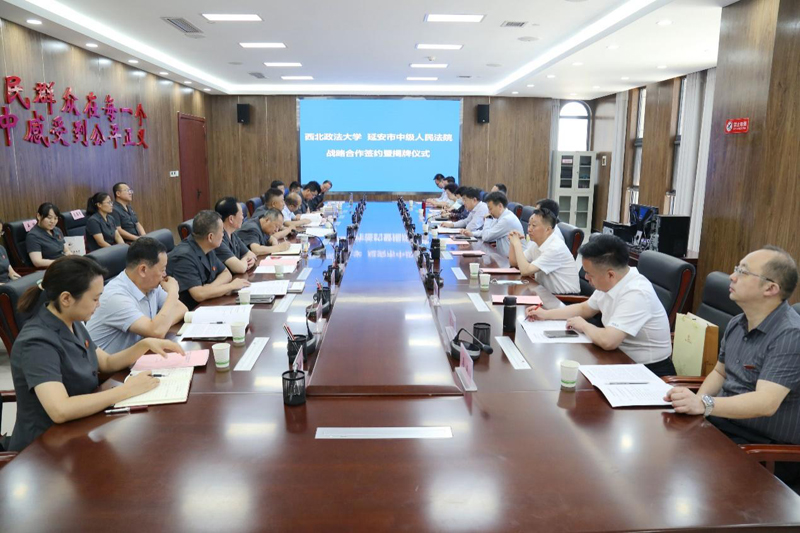 在延安市中级人民法院,beat365与延安中院战略合作签约暨“法科研究生实践教学基地”揭牌仪式顺利举行。延安中院党组副书记、副院长雷钧主持仪式。双方先后签订了《院校合作框架协议》和《马锡五式人民法庭创建与诉源治理的延安样本》科研项目合作协议,范九利与刘群为“beat365英国官网法科研究生实践教学基地”揭牌。