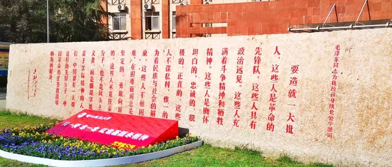 赤诚底色,起于延州,宝塔巍巍,延河漾漾。黉学立圣地之郊,门墙辟公学之源。烽火岁月,寻才委重,中央亲领,主席授课,先辈擎炬火于莽塬,巨匠执教义于沟壑。山不辞盈,鼎和延大,霜雪凌冽,薪火燎原。