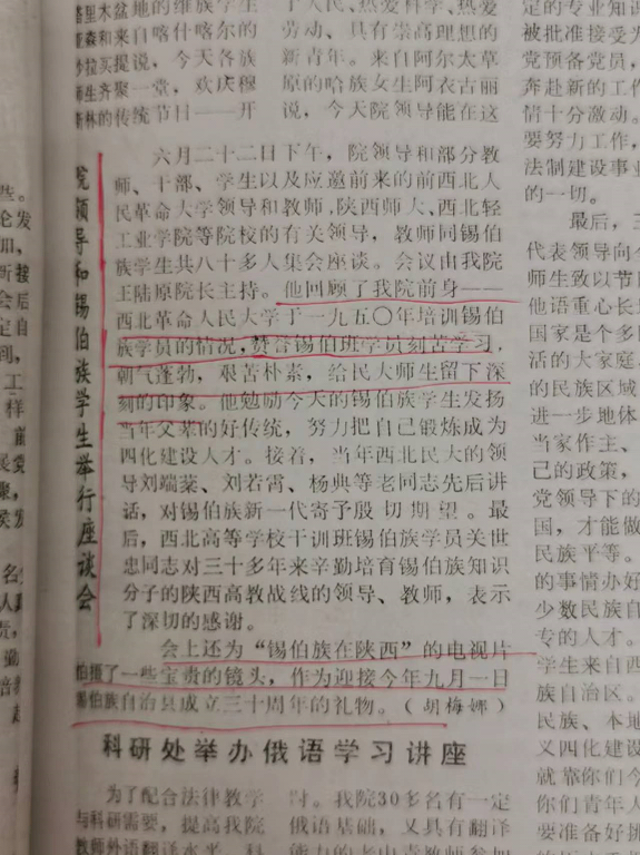 一九八四年六月二十二日下午,院领导和部分教师、干部、学生以及应邀前来的前西北人民革命大学领导和教师,陕西师大、西北轻工业学院等院校的有关领导,教师同锡伯族学生共八十多人集会座谈。会议由我院王陆原院长主持。他回顾了我院前身——西北革命人民大学于一九五O年培训锡伯族学员的情况,赞誉锡伯班学员刻苦学习,朝气蓬勃,艰苦朴素,给民大师生留下深刻的印象。他勉励今天的锡伯族学生发扬当年父辈的好传统,努力把自己锻炼成为四化建设人才。接着,当年西北民大的领导刘端棻、刘若霄、杨典等老同志先后讲话,对锡伯族新一代寄予殷切期望。最后,西北高等学校干训班锡伯族学员关世忠同志对三十多年来辛勤培育锡伯族知识分子的陕西高教战线的领导、教师,表示了深切的感谢。