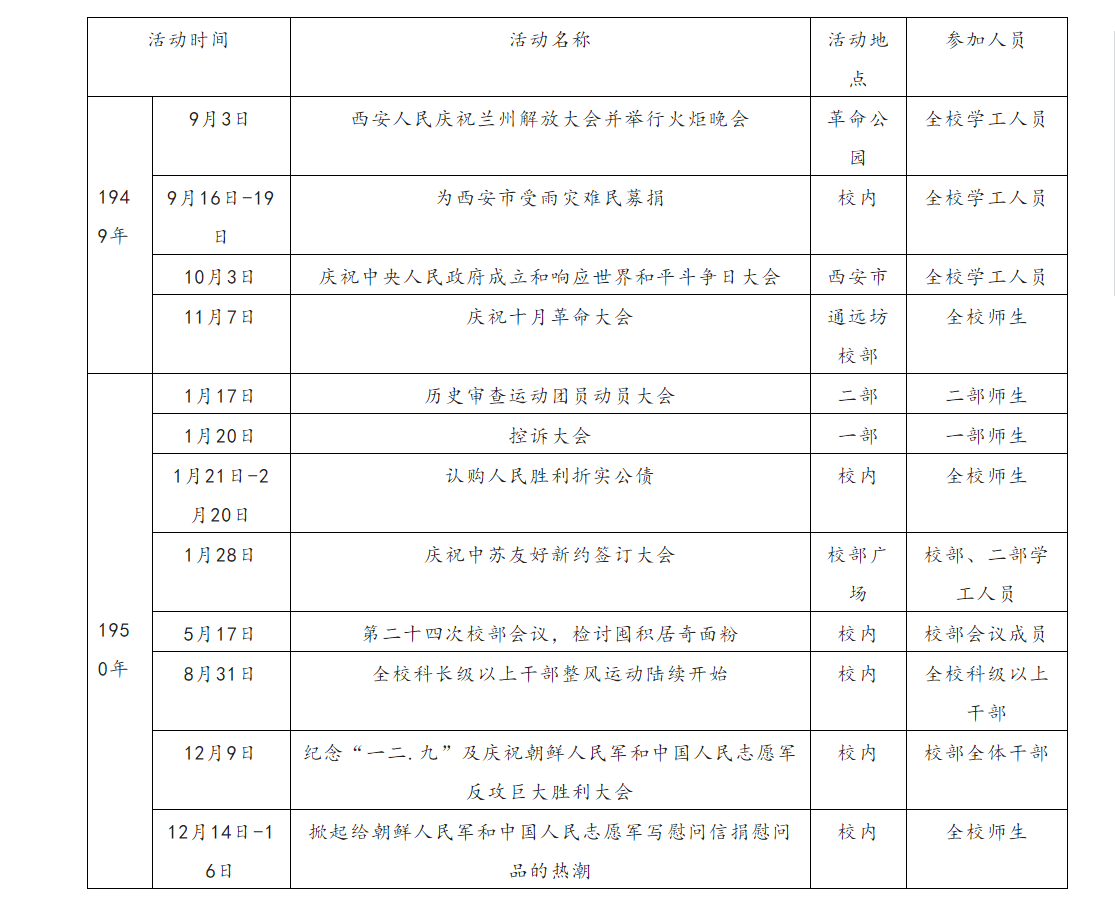 尽管学校只存在了近四年的时间,但这四年(1949年6月至1953年6月)是当代中国历史上波澜壮阔的重要历史时期,革命形势日新月异、新中国建设百废待兴、各种政治运动接踵而至。这一时期仍然属于新民主主义革命阶段,比较重大的历史事件有新中国成立、抗美援朝战争、土地改革运动、镇压反革命运动、知识分子思想改造运动、增产节约运动、“三反”运动、“五反”运动等等。根据《民大生活》的记载和很多学员的回忆,限于篇幅,仅以1949年、1950年为例,笔者简要整理了这两年学校师生的一些重大活动。
