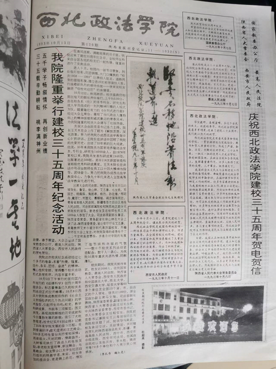 第一次是1993年10月12日,学校隆重举行建院三十五周年纪念活动。活动当天,秋雨淅沥,校庆盛典仍如期在喧天的鼓乐声中举行。由在校各系的学生组成一列列精神抖擞的入场式方队依次经过主席台。庆祝大会由院党委书记张力主持,王天木院长作了题为《解放思想,深化改革,努力把我院办成西北法学教育中心》的讲话。出席大会,并讲话的有司法部、陕西省及有关方面的领导。青海省高级人民法院、新疆维吾尔自治区高级人民法院、司法部部属院校和陕西地区部分兄弟院校的领导、新老校友及在校师生员工5000余人参加了大会。大会还宣读了国家教委办公厅、最高人民法院、陕西省人大常委会、西安市人民政府的贺电贺信。