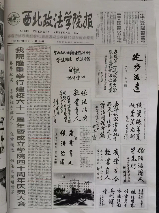 第二次是1998年10月12日,学校隆重举行建校六十一周年暨成立学院四十周年庆典大会。校庆前夕,教育部、最高人民检察院办公厅为我院发来贺电。司法部、陕西省委、省政府等各级领导为我院校庆题词。各兄弟院校,陕西省和各省公、检、法、司等单位和校友也在校庆前夕或校庆当日发来贺电、贺信并送来捐款、礼品等物。庆祝大会由院党委书记张力主持,会上来自司法部、陕西省的领导、校友代表嘉宾代表作了讲话;院长陈明华教授作了题为《发扬光荣传统,再创学院辉煌》的致辞。出席庆典大会的还有各地部分公、检、法、司的领导,陕西省部分高校的领导和代表,我院前任领导;外国在我院访问、任教、学习的外宾和参加校庆的来自祖国各地的校友及来宾三千余人和近万名师生员工。