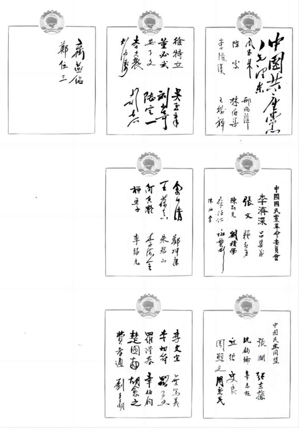 就党派代表而言,可以看到中国国民党革命委员会首席代表李济深的签字和签名,其字体取法魏碑,运笔凝重有力,结字端庄沉稳。中国民主同盟首席代表张澜的签名端雅隽永、点画精到、笔致翩翩、平正宽博,工整沉稳中又见俊逸清雅之姿。民主建国会首席代表黄炎培的签名端庄秀丽,因为他一直坚持“临池白首学为人”,又特别擅长楷书和行书,他在广游名山大川时,凡遇碑刻即悉心揣摩,黄炎培留在宣纸上的签名,给人秀逸之美。无党派民主人士首席代表郭沫若是书法大家,他的书法既重师承,又多创新。他以“回锋转向,逆入平出”为执笔八字要诀,用书法展现他大胆的创造精神和鲜活的时代特色。中国民主促进会首席代表马叙伦的签名,能看出他极尊重传统,动笔和结构有法度、有风骨,是一位有品位的书法大家。中国农工民主党首席代表彭泽民、三民主义同志联合会首席代表谭平山、中国国民党民主促进会首席代表蔡廷锴、中国致公党首席代表陈其尤、九三学社首席代表许德珩、台湾民主自治同盟首席代表谢雪红,都签写了单位和签名。曾有人撰文,谢雪红的亲笔手迹是最难得一见的。其实,我们不仅在签名册上完整地看到了她的签名,也看到了她多年后留下的亲笔信函。这字迹当属珍稀珍贵。