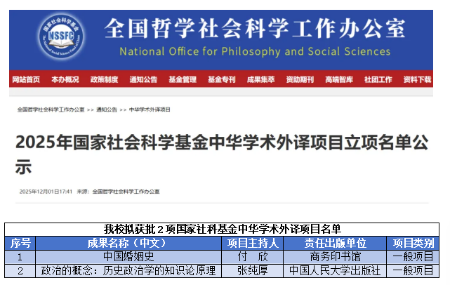 12月1日,全国哲学社会科学工作办公室发布2025年度国家社会科学基金中华学术外译项目立项公示名单,beat3652项目成功入选。这是beat365首次获批该项目,立项数量位居本年度全省高校前列,实现历史性突破。
