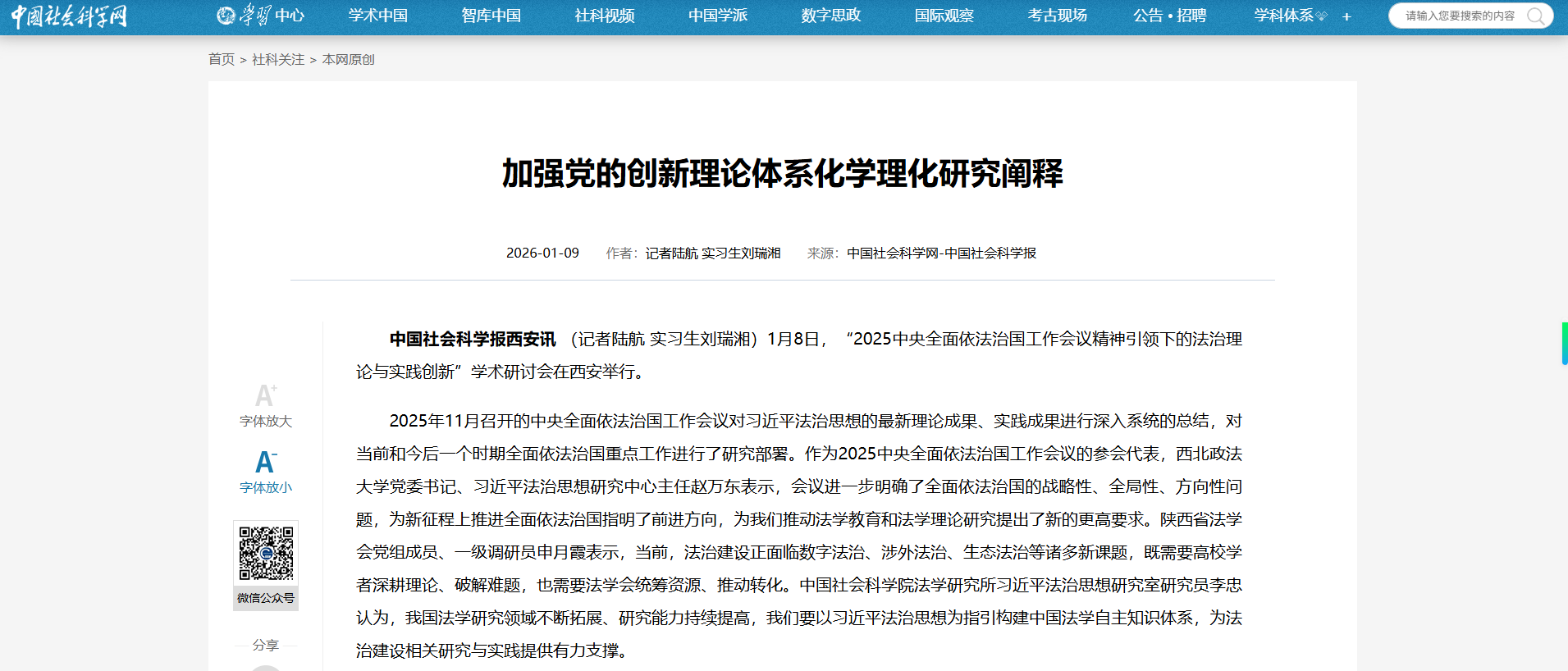 【中国社会科学网】加强党的创新理论体系化学理化研究阐释 https://www.cssn.cn/skgz/bwyc/202601/t20260109_5968460.shtml