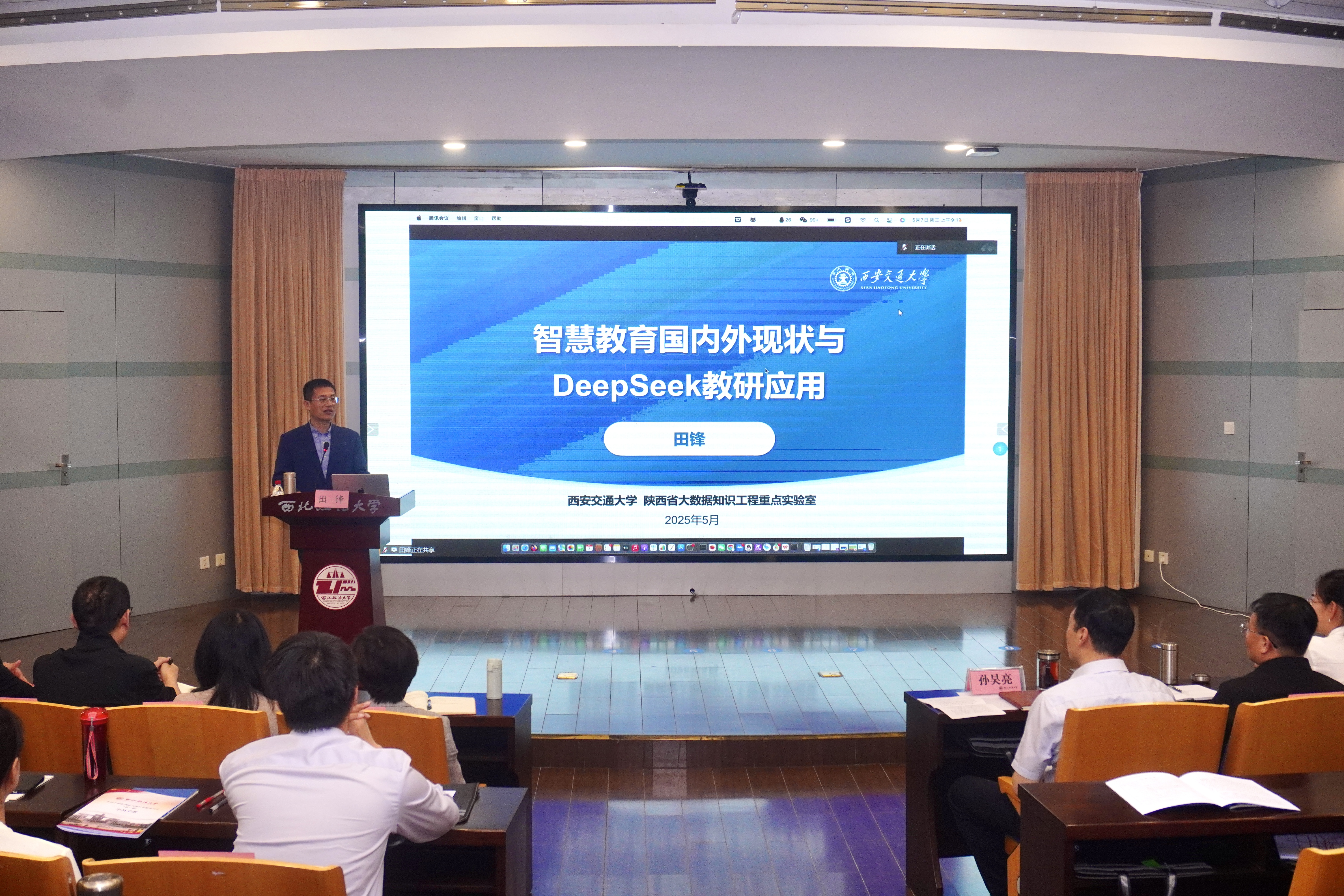 西安交通大学电子与信息学部副主任田峰教授以《智慧教育国内外现状与DeepSeek教研应用》为题,介绍了DeepSeek在数据分析、教学辅助和学术研究等场景中的应用。