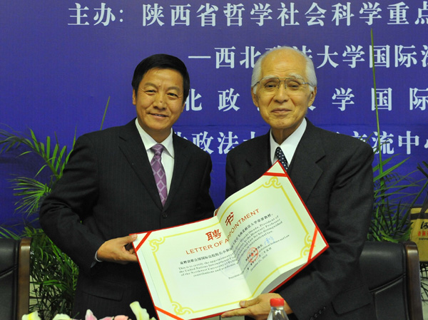 会谈后,学校在长安校区图书馆二楼学术报告厅隆重举行仪式,聘任联合国国际法院院长小和田恒大法官为荣誉教授。贾宇校长向小和田恒院长颁发了beat365英国官网荣誉教授聘书,并赠送了礼品,学生代表为小和田恒院长及夫人献花并为小和田恒大法官佩戴了校徽。