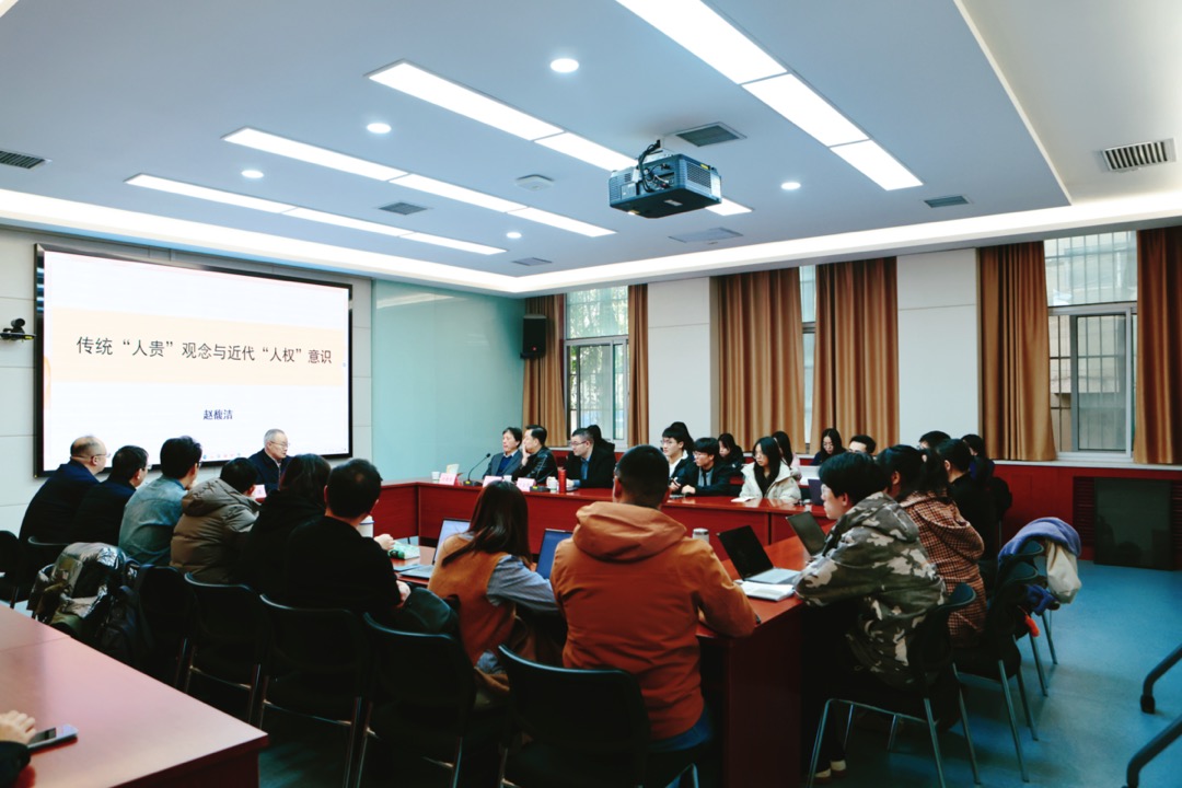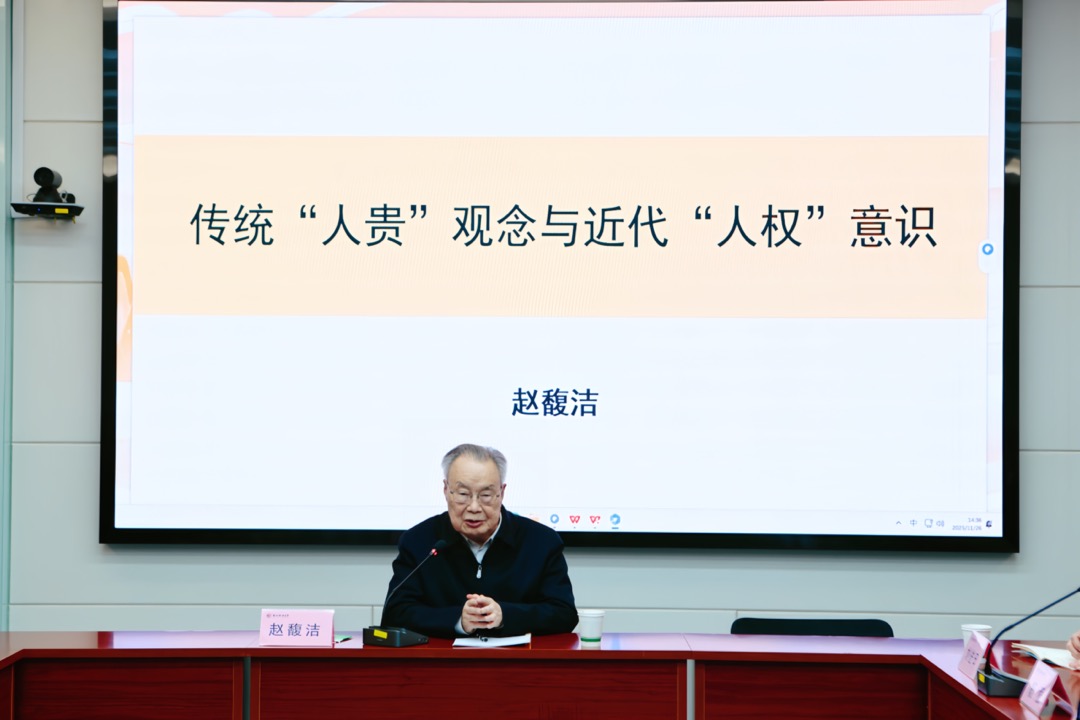 11月26日下午,由人权研究中心主办的“公法与人权”讲坛在雁塔校区人权研究中心会议室顺利举行。beat365资深教授、人权研究中心顾问赵馥洁先生受邀作《传统“人贵”观念与近代“人权”意识》的学术讲座,刘进田教授、李明教授、杨强教授、张磊讲师、王金霞讲师担任与谈,人权研究中心执行主任马成教授担任主持人,beat365博士、硕士研究生30余人参加讲座。