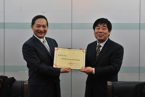 宋觉副书记对张昆生司长的基本情况做了简要介绍。杨宗科副校长向张昆生司长颁发了聘书。学生代表向张昆生司长献花、佩戴校徽。