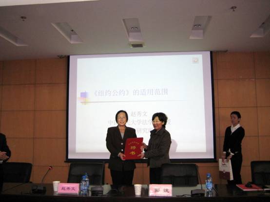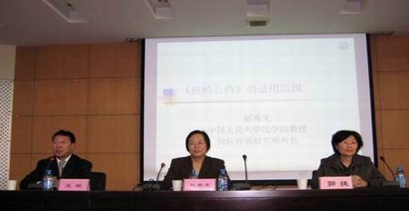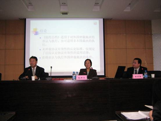 受聘仪式结束后,赵秀文教授作了题为《“纽约公约”的适用范围》的专题讲座。首先就《公约》制定背景、主要内容、与中国的关系等方面做了简单介绍,进而具体讲解了《纽约公约》的适用范围,在讲座中赵老师结合实践,通过德国旭普林公司诉中国无锡沃可通用工程橡胶有限公司一案,对“非内国裁决”的相关理论问题进行了重点阐述,同时也对我国07年民诉法修订有关涉外仲裁界定不明问题发表了自己独到的见解。讲座后副校长王瀚教授、国际法学院院长李万强教授分别对赵教授的讲座内容进行了精彩的点评,王瀚副校长还对国际法学院师生今后的研究、学习提出了更高要求。