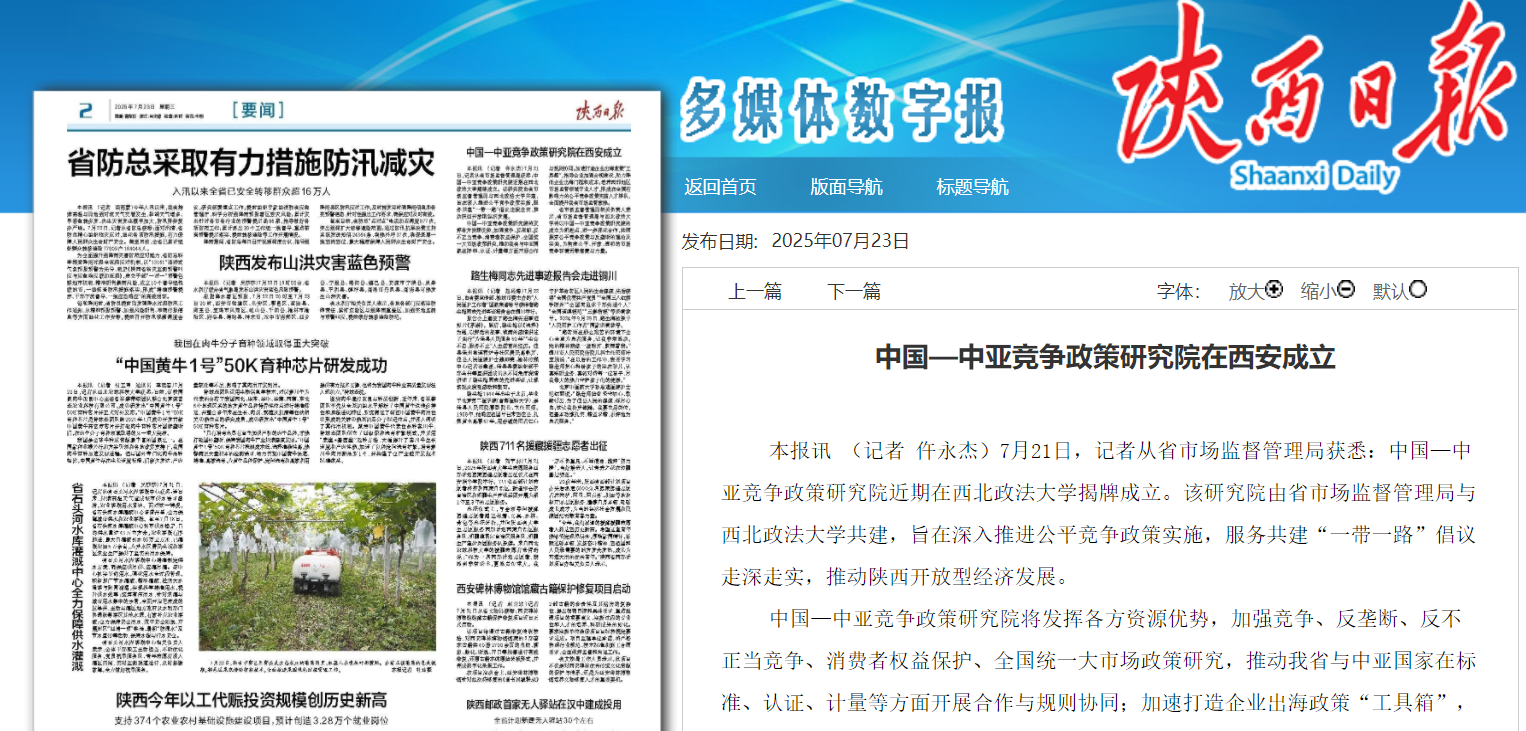 【陕西日报】中国—中亚竞争政策研究院在西安成立:https://esb.sxdaily.com.cn/pc/content/202507/23/content_913926.html