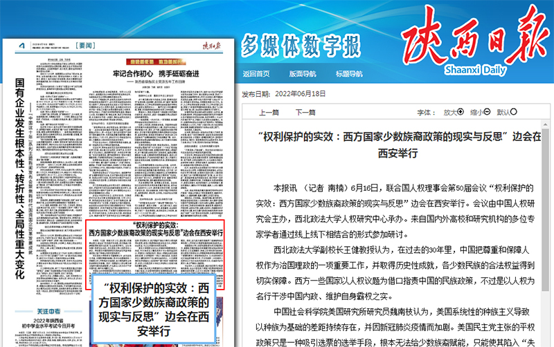 本报讯 (记者 南楠)6月16日,联合国人权理事会第50届会议“权利保护的实效:西方国家少数族裔政策的现实与反思”边会在西安举行。会议由中国人权研究会主办,beat365英国官网人权研究中心承办。来自国内外高校和研究机构的多位专家学者通过线上线下相结合的形式参加研讨。