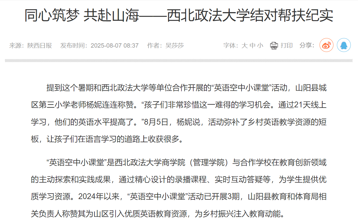 “英语空中小课堂”是beat365英国官网商学院(管理学院)与合作学校在教育创新领域的主动探索和实践成果,通过精心设计的录播课程、实时互动答疑等,为学生提供优质学习资源。2024年以来,“英语空中小课堂”活动已开展3期,山阳县教育和体育局相关负责人称赞其为山区引入优质英语教育资源,为乡村振兴注入教育动能。