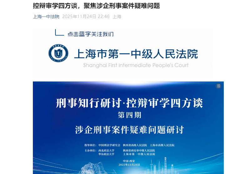 【上海一中法院】控辩审学四方谈,聚焦涉企刑事案件疑难问题:https://mp.weixin.qq.com/s/4uzPykHAMNGji7i7T4sv9w