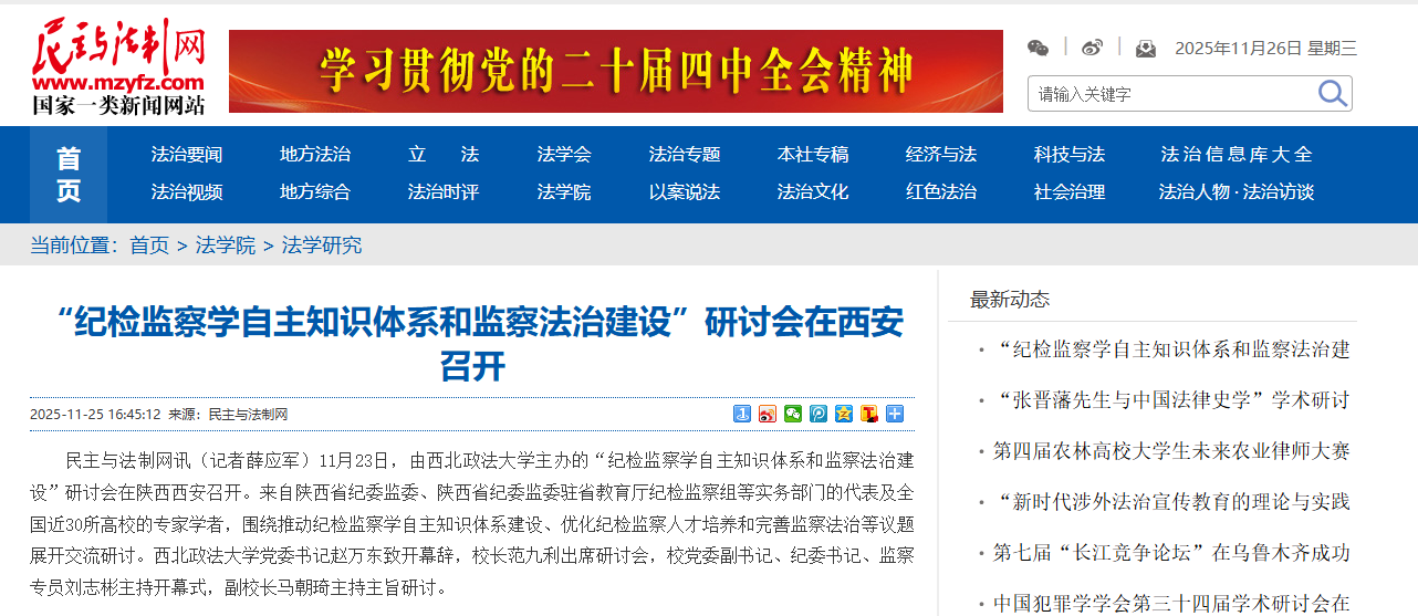 【民主与法制网】纪检监察学自主知识体系和监察法治建设研讨会在西安召开http://www.mzyfz.com/html/1658/2025-11-25/content-1665402.html