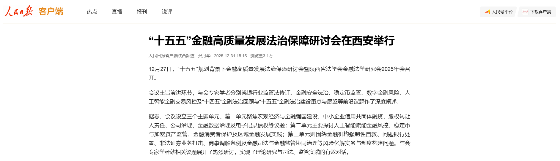 【群众新闻】金融高质量发展法治保障研讨会在西安举行 https://www.sxdaily.com.cn/2025-12/30/content_11469245.html#10006-weixin-1-52626-6b3bffd01fdde4900130bc5a2751b6d1