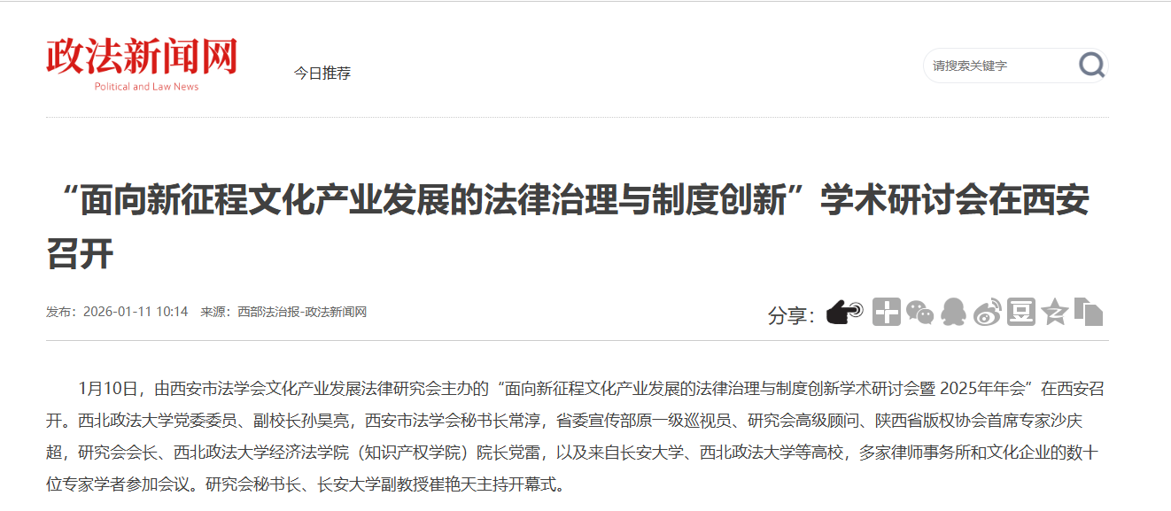 【政法新闻网】“面向新征程文化产业发展的法律治理与制度创新”学术研讨会在西安召开https://www.xbfzb.com/2026-01/11/content_11482225.html#10006-weixin-1-52626-6b3bffd01fdde4900130bc5a2751b6d1