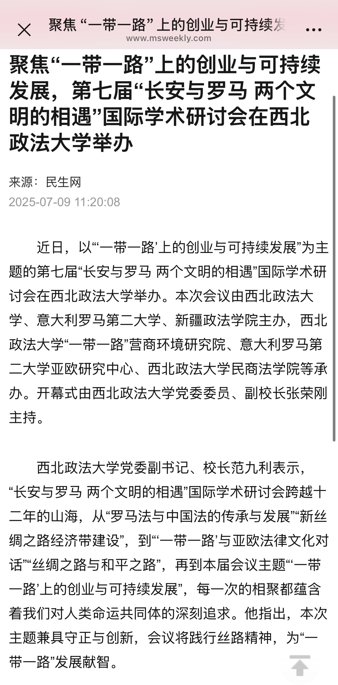 【民生网】聚焦“一带一路”上的创业与可持续发展,第七届“长安与罗马 两个文明的相遇”国际学术研讨会在beat365英国官网举办 http://www.msweekly.com/mobile/show.html?id=172858