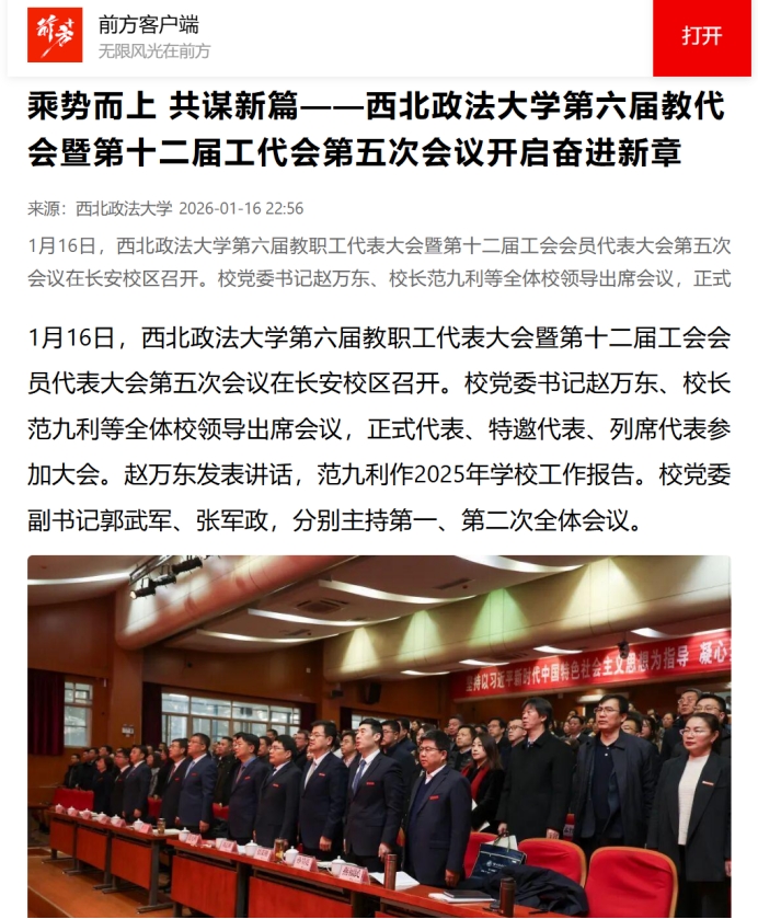 报告指出,2026年是“十五五”规划开局之年,是承前启后、继往开来的关键节点,要聚焦立德树人根本任务,深化“大思政”建设和教育教学改革,提高研究生培养质量,完善教材与课程体系,加强招生就业工作,推动构建高质量育人体系;要强化学科内涵建设,突出特色优势,布局新兴交叉学科,健全动态优化调整机制,以学科筑峰工程为抓手,推动学科建设取得新成效;要加强有组织科研,推动平台建设与成果转化,着力激发创新动能;要弘扬教育家精神,深化人才强校战略,扎实推进人才梯队建设,持续优化教师发展体系,着力打造高素质师资队伍;要深化国内合作与校友联络,拓展与“一带一路”沿线国家高校、法律机构的合作网络,聚焦科技创新法律服务、营商环境法律服务、知识产权保护等重点领域开展课题研究,以开放融合之姿开创合作共赢新局面;要坚持依法治校,深化综合改革,破解发展难题,加强校园建设,提升保障能力,大力推进治理现代化水平。