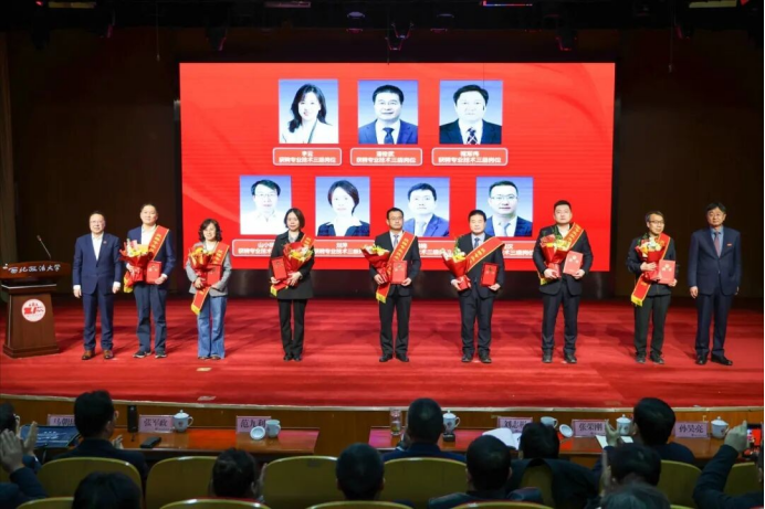 大会举行了隆重的表彰及聘任仪式。赵万东、范九利共同为享受国务院政府特殊津贴专家汪世荣教授颁发荣誉证书并佩戴绶带。赵万东、汪世荣与全国模范教师、校学术委员会副主任刘进田,分别为马朝琦(陕西省三秦英才特支计划哲学社会科学和文化艺术领域领军人才)、刘润泽(陕西省三秦英才引进计划青年项目入选者)、李锋(陕西省中青年科技领军人才)、李丹丹及徐海俊(陕西省青年科技新星)、边晓宏(全国“敬老爱老助老模范人物”称号获得者)、舒洪水(陕西省“十大法治人物”称号获得者)等7位省级以上人才称号及荣誉获得者颁发荣誉证书、佩戴绶带,向2位新聘专业技术二级岗位教师颁发聘书。范九利和陕西省师德标兵、“陕西省黄大年式教师团队”负责人王瀚教授共同为14位新聘专业技术三级岗位教师、教授职称教师颁发聘书。