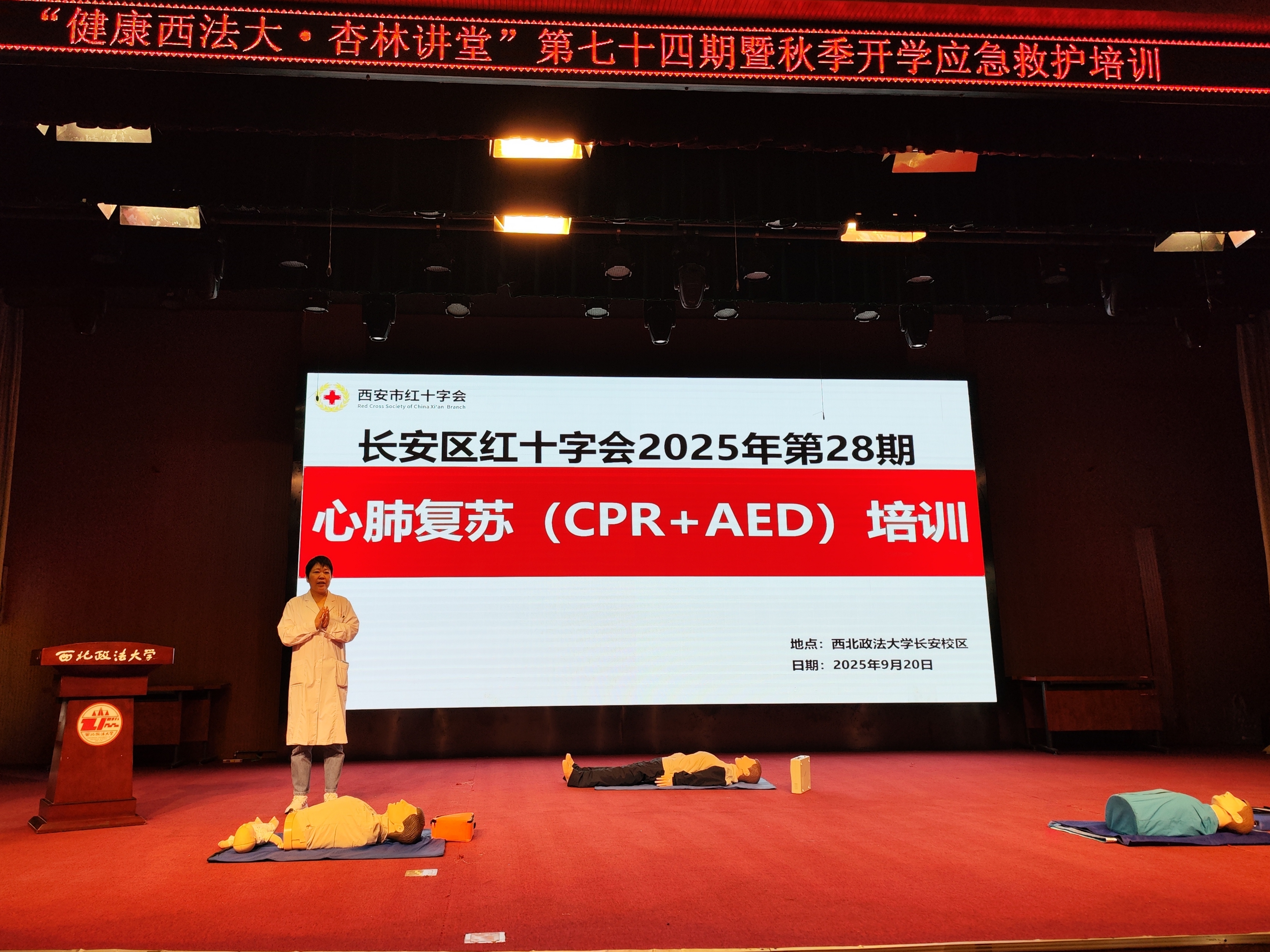 活动分为理论讲解与实践演练两大环节。理论环节,西安市红十字会主讲师陈莉以生动的方式详细讲解了心肺复苏(CPR)过程、自动体外除颤仪(AED)使用以及气道异物梗阻急救技巧等知识,特别强调了如何有效进行胸外心脏按压、开放气道、实施人工呼吸等关键环节要点,结合现场演示,让参训人员有了切实的直观感受。她强调,在心脏骤停等紧急情况下,专业规范的急救措施可以对抢救患者的生命争取宝贵的黄金救援时间,掌握急救技能对于生命的安危具有重要意义。实践阶段,红十字会的讲师们和校门诊部的医务人员分组带队,通过模拟演练的方式对每名学员进行面对面指导、一对一纠正。随后,参训学员进行了线上理论和实操练习考核。