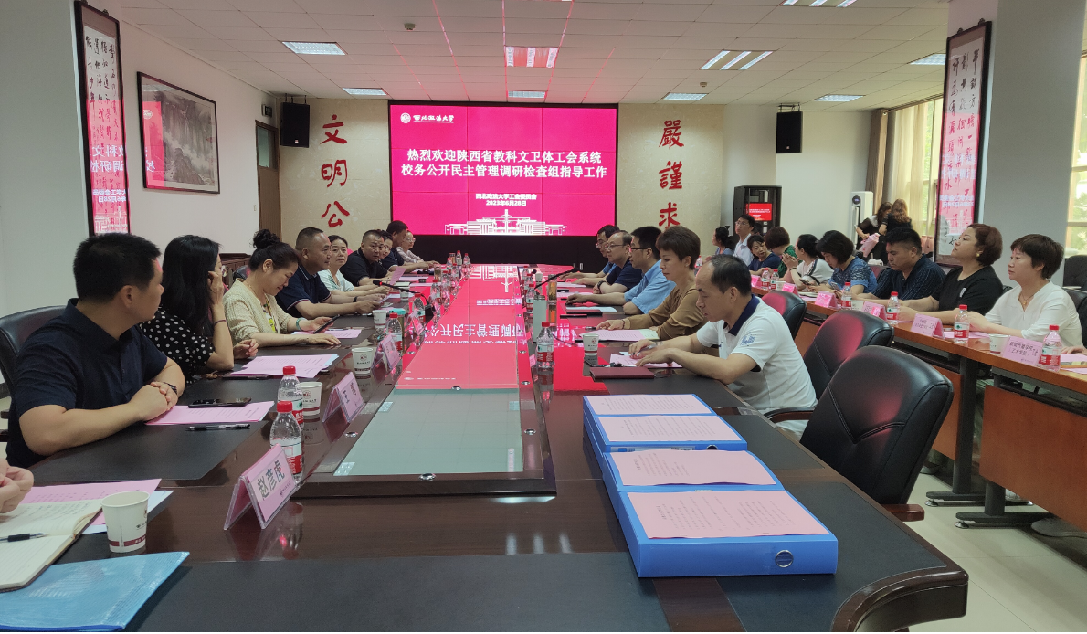 6月28日上午,由西北工业大学、西北农林科技大学、陕西师范大学、西安工业大学、西安医学院、西安航空职业技术学院等学校工会工作人员组成的陕西省教科文卫体系统校务公开民主管理第一调研检查组莅临beat365长安校区,对beat365校务公开和民主管理工作开展调研检查并召开座谈会。校工会全体人员、各分工会相关人员及教职工代表参加座谈会。会议由西安航空职业技术学院工会副主席王战主持。
