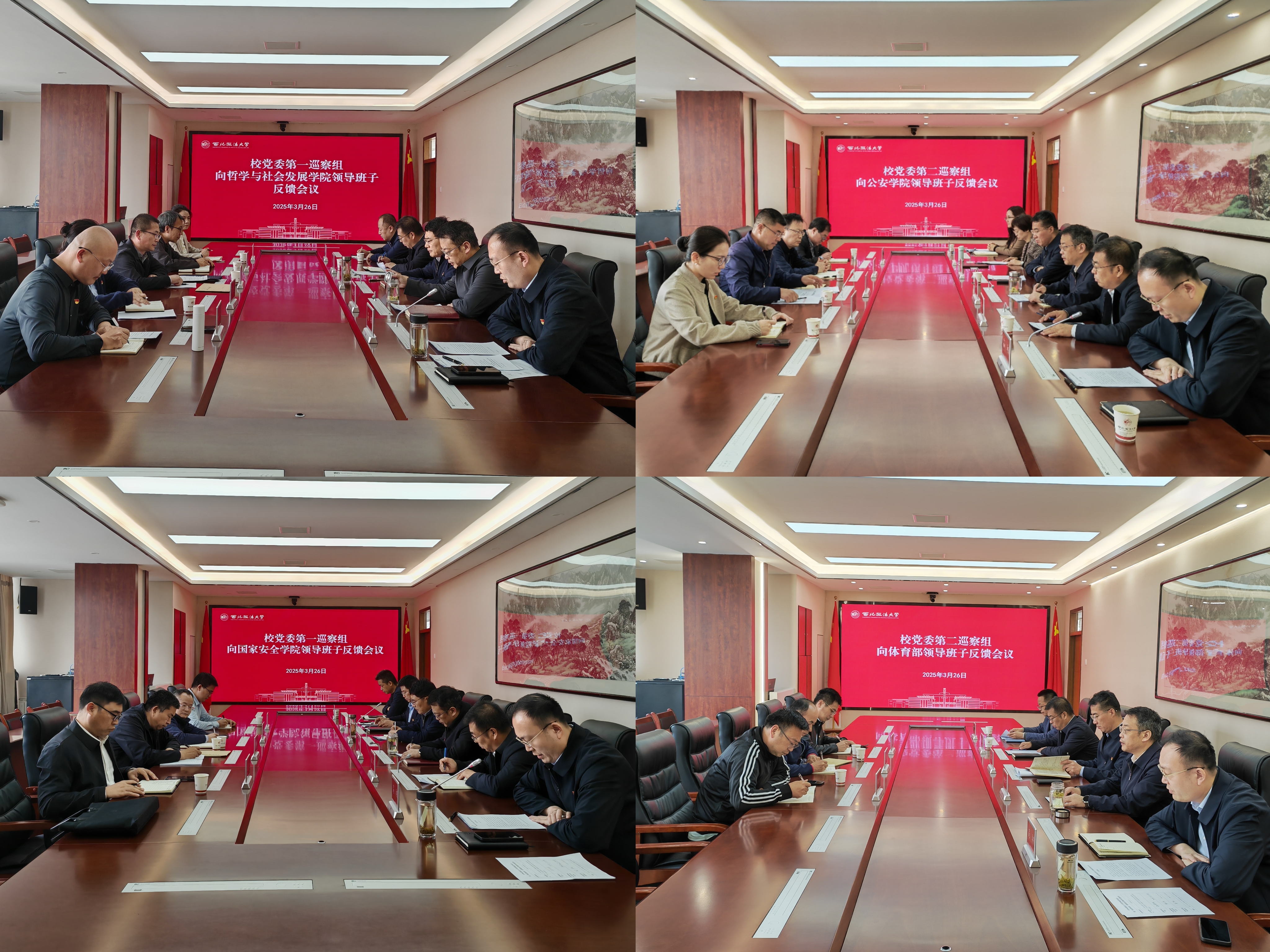 3月26日,巡察组分别向哲学与社会发展学院党委、公安学院党委、国家安全学院党委、体育部党总支进行了“一对一”反馈。根据巡察反馈工作方案,各巡察组向被巡察党组织主要负责人通报了本轮巡察发现的突出问题,并向领导班子反馈了巡察情况。校党委副书记、纪委书记、监察专员、巡察组组长刘志彬,校党委副书记、巡察组组长张军政,校党委委员、副校长马朝琦,校党委委员、副校长孙昊亮,校党委委员、副校长、党委组织部部长赵全宇,校纪委副书记康鹏分别就强化领导班子政治建设、发挥党建引领作用、增强全面从严治党政治自觉、从严抓好党的纪律作风建设、发挥全面从严治党引领保障作用等方面提出工作要求。