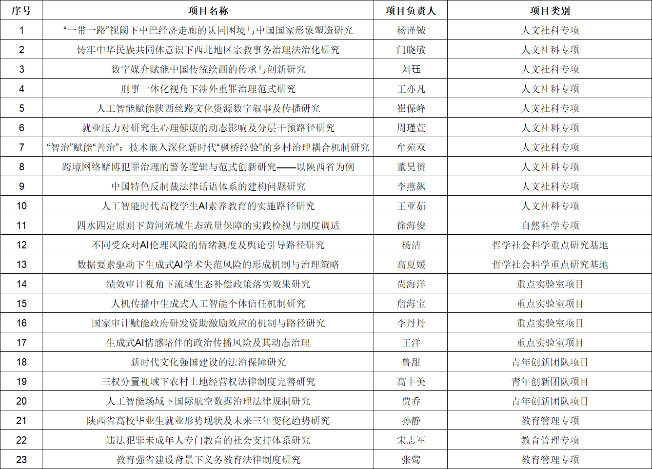 近日,陕西省教育厅发布了《陕西省教育厅关于下达2025年度科学研究计划项目的通知》,beat365再获佳绩,共有23个项目获批立项。其中人文社科类专项10项、自然科学类专项1项、哲学社会科学重点研究基地项目2项、重点实验室项目4项、青年创新团队项目3项、教育管理专项3项。研究方向紧扣国家战略与区域发展需求,涉及“一带一路”建设,生成式AI治理、法治教育等前沿领域,充分彰显了beat365的科研特色与创新实力。