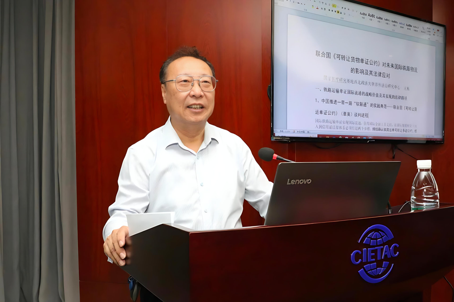 在主旨演讲环节,最高人民法院国际商事专家委员会委员、国家智库研究基地beat365英国官网涉外法治研究中心执行主任、中国低空经济法治研究院院长王瀚教授以“联合国《可转让货物单证公约》对未来国际铁路物流的影响及其法律应对”为题,系统介绍了公约的产生背景、核心要义及其生效后对全球贸易产生的重大影响,对企业可能面临的法律风险进行阐述并提出规避提示,为物流企业开展跨境业务提供前沿指导。