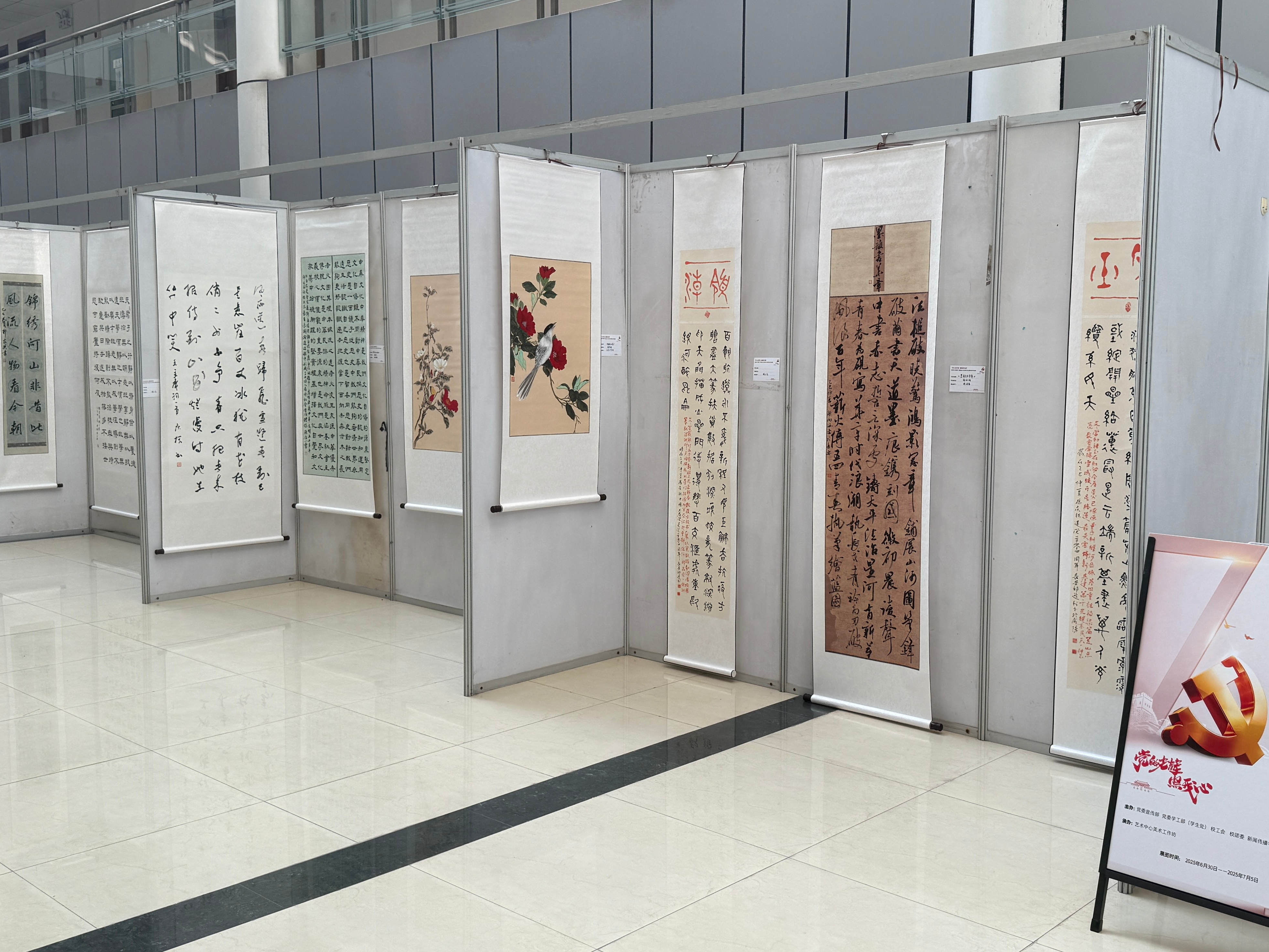 7月1日,“丹心绘党魂·翰墨颂华章”纪念中国人民抗日战争胜利80周年师生书画作品展在校务楼一楼大厅举办。校党委书记赵万东、校党委副书记郭武军、校党委副书记张军政参加活动。