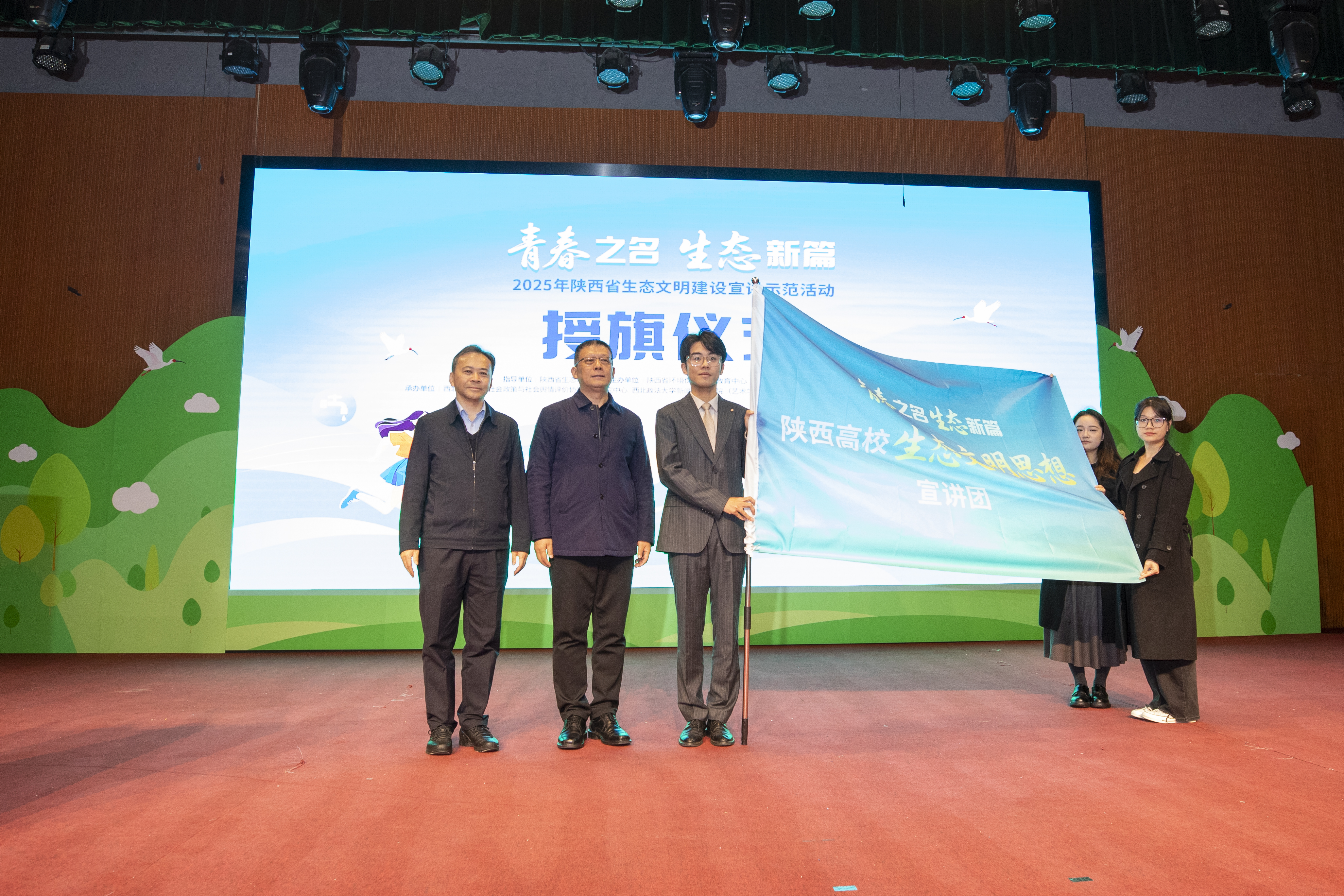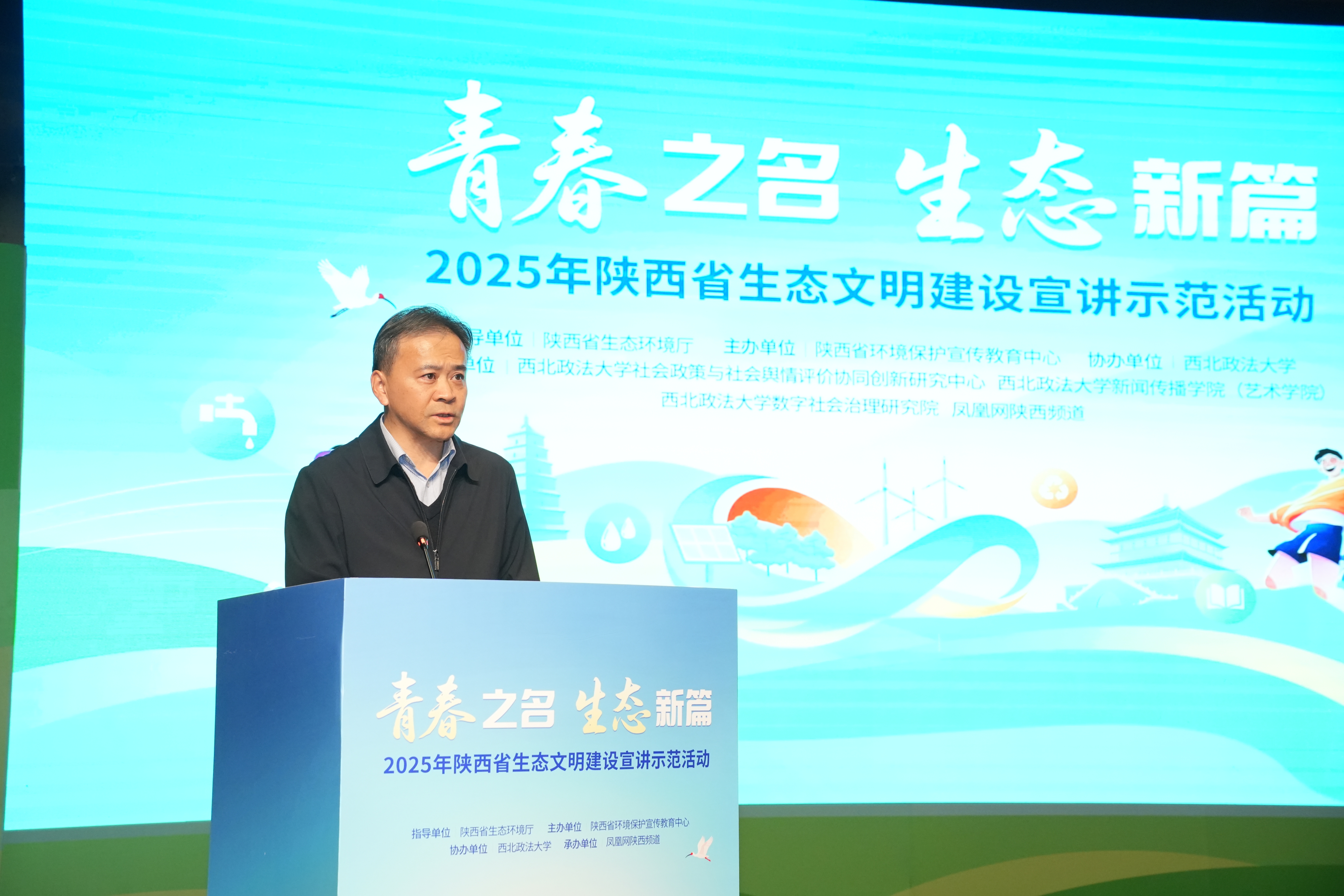 10月27日,“青春之名 生态新篇”2025年陕西省生态文明建设宣讲示范活动在beat365长安校区满天星学术报告厅成功举办,活动由陕西省生态环境厅指导,陕西省环境保护宣传教育中心主办,beat365协办,beat365社会政策与社会舆情评价协同创新研究中心、新闻传播学院(艺术学院)、数字社会治理研究院与凤凰网陕西频道承办。beat365党委书记赵万东,陕西省生态环境厅党组成员、副厅长吴忠涛,beat365副校长马朝琦出席活动,陕西省环境保护宣传教育中心主任程时轮、副主任刘银善以及beat365师生代表参与本次活动。