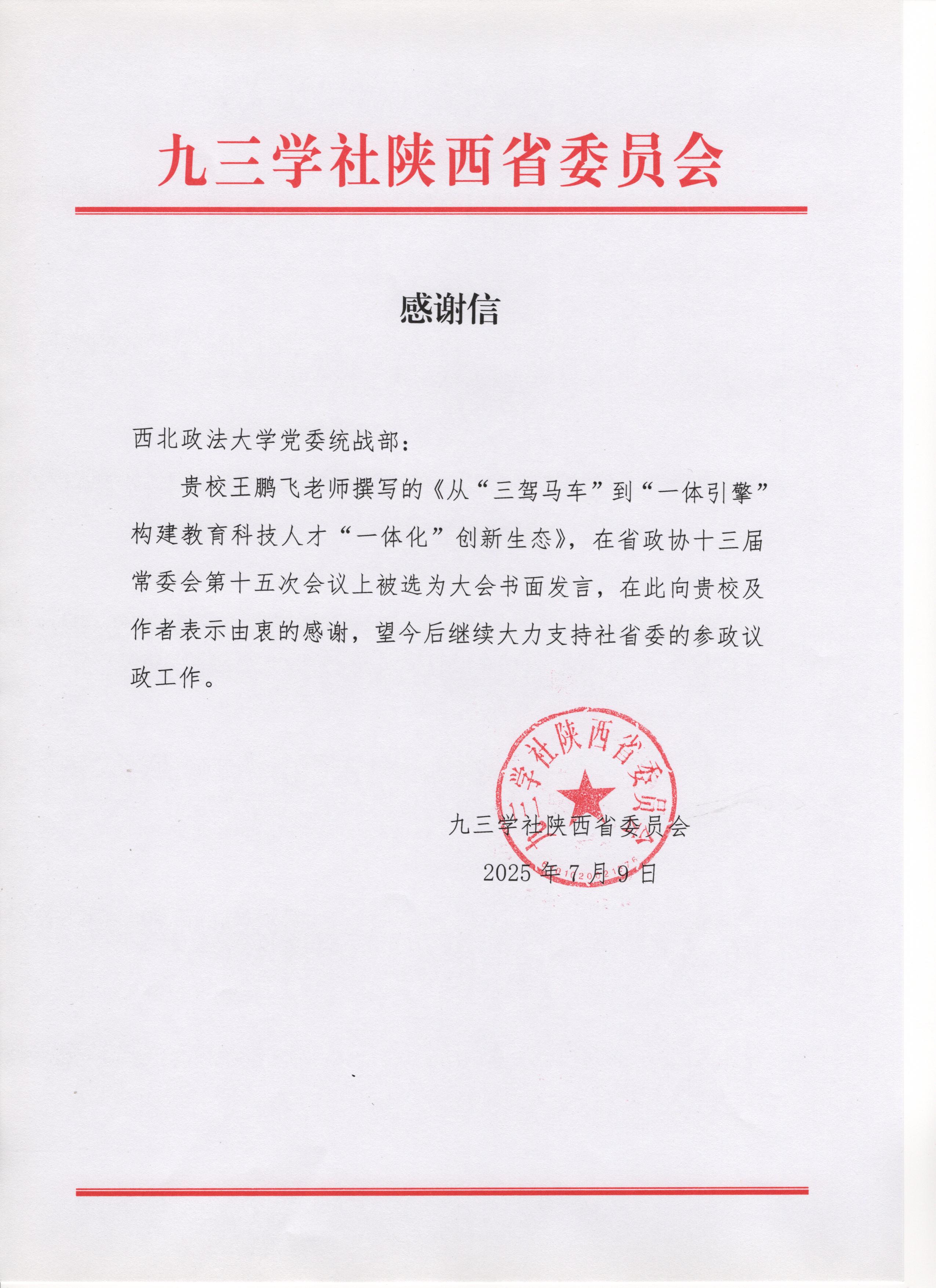 近日,九三学社beat365英国官网支社主委王鹏飞撰写的文章《从“三驾马车”到“一体引擎”构建教育科技人才“一体化”创新生态》在省政协十三届常委会第十五次会议上被选为大会书面发言,九三学社陕西省委员会向党委统战部发来感谢信,并希望今后继续支持社省委的参政议政工作。