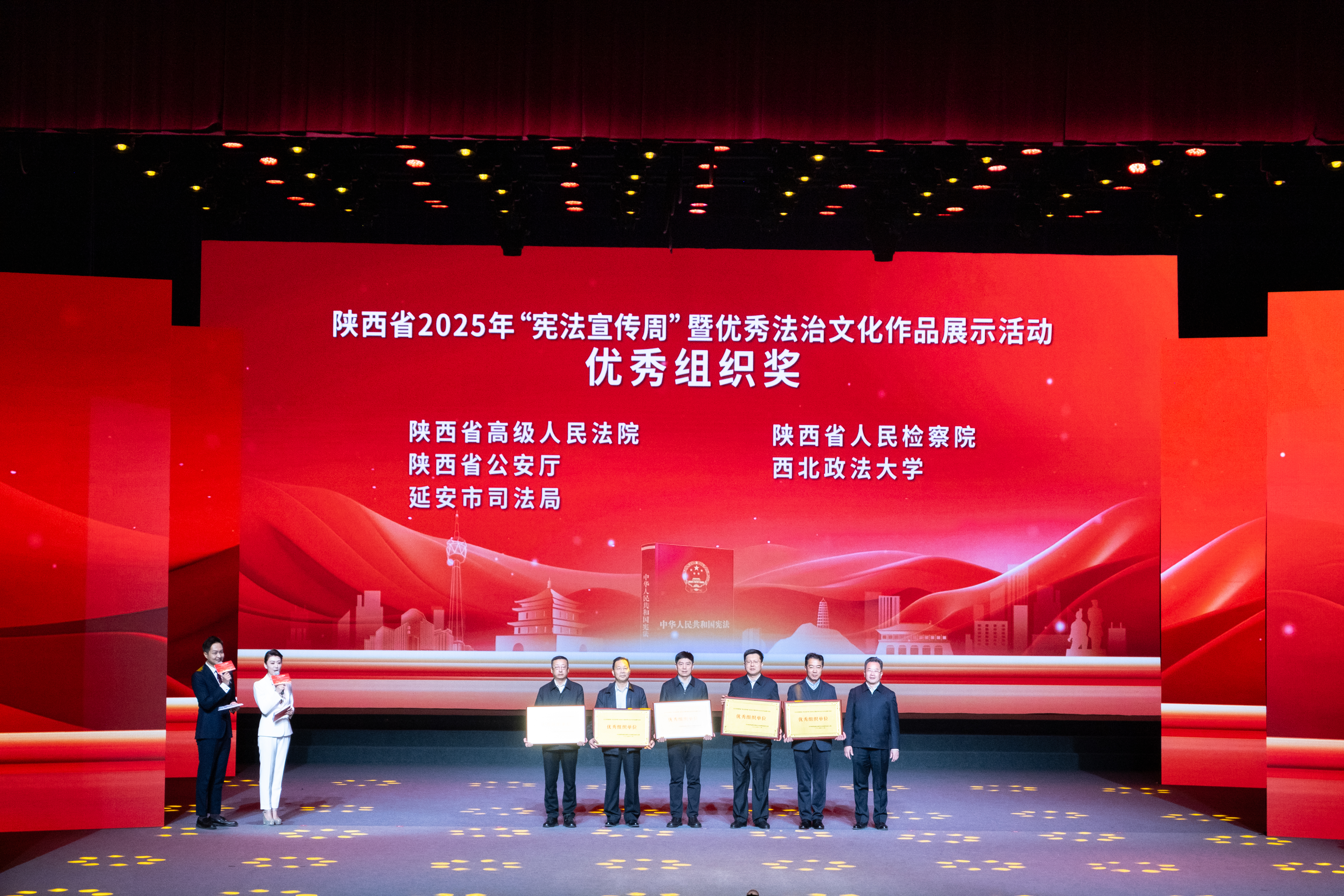 本次活动以“学习宣传贯彻习近平法治思想,推动宪法深入人心”为主题,设置了优秀法治文化作品展示和“宪法宣传周”启动两个环节,beat365荣获“优秀组织单位”称号。启动仪式上,beat365新闻传播学院(艺术学院)学子以合唱形式唱响《我们走在大路上》,用艺术形式展现法治信仰,以青春之音传递法治理念。beat365陕西省大学生法治宣讲团现场表演宪法诵读节目,将法治元素与艺术形式完美结合,全面展示自身在宪法宣传方面的特色亮点,彰显青年学子蓬勃向上的精神风貌。