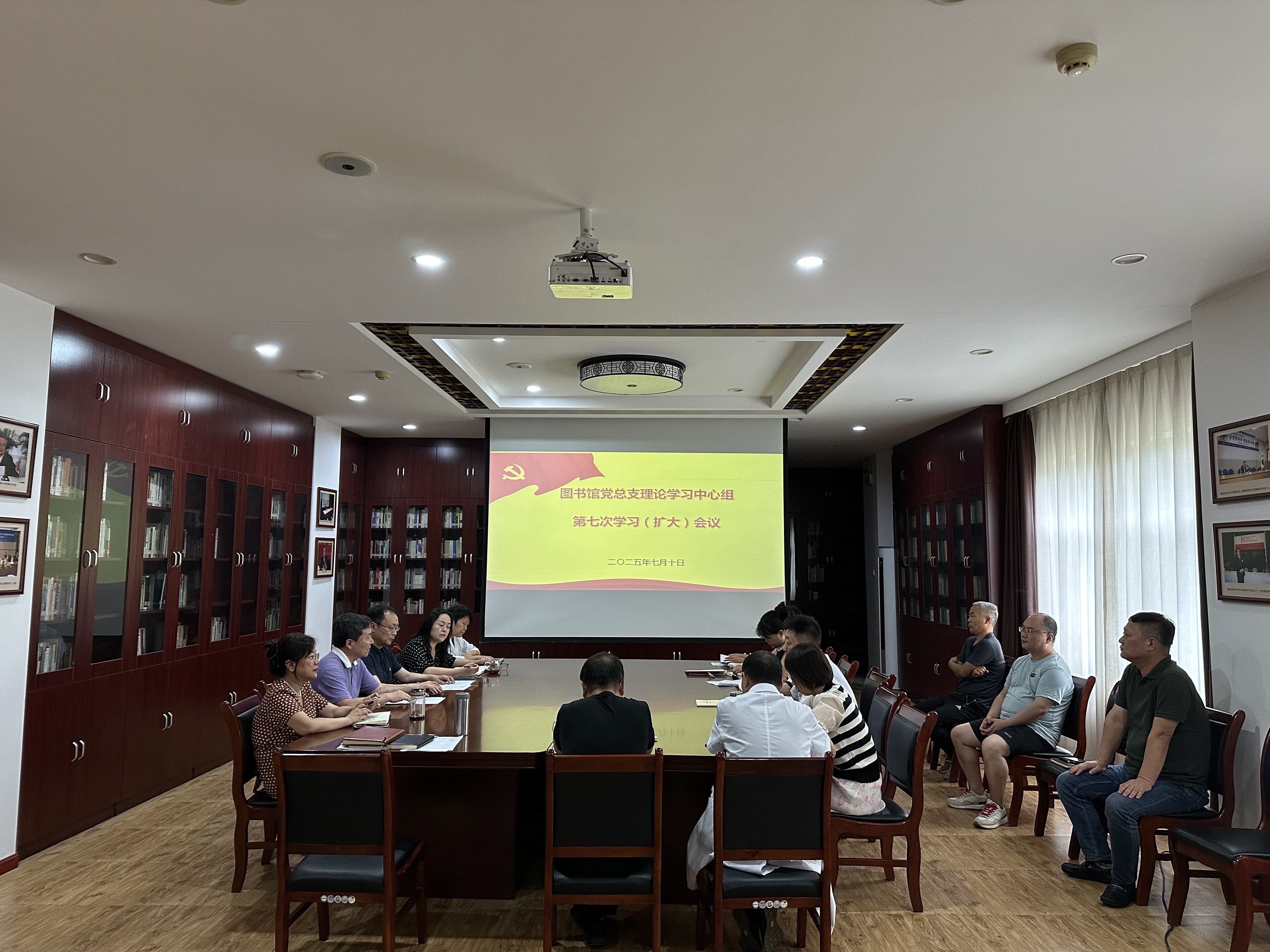 7月10日,图书馆党总支理论学习中心组(扩大)在长安校区图书馆召开学习会议,中心组全体成员参加,党总支书记翁晓磊主持会议。