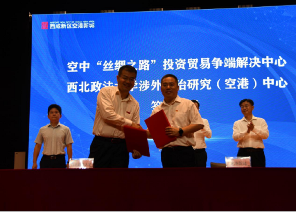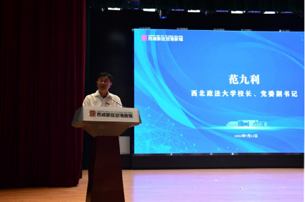 会议议程分为第一阶段:空港新城稳增长、促发展暨重点项目签约大会,第二阶段:空港新城七一表彰大会。在第一阶段临空涉外中心揭牌仪式上,范九利作了重要致辞。认为西咸新区空港新城作为西北地区唯一、全国第6个空港型国家物流枢纽,近年来持续提升西安国际航空枢纽能级,不仅助推各类生产要素快速流动,还带动各类产业群迅猛发展,而即将在此成立的beat365英国官网涉外法治研究(空港)中心和“空中丝绸之路”投资贸易争端解决中心意义重大、影响深远。作为国家级涉外法治研究基地的实务拓展平台,中心将充分发挥学校法学学科优势、专家教授人才优势和丝绸之路经济带地缘优势,助推临空经济发展和临空产业聚集。同时,“空中丝绸之路”投资贸易争端解决在这里做到顶格落实、顶格推进,既能为境外企业“走进来”提供便捷、专业、高效的法律服务,也将为境内企业“走出去”提供全程化、专业化和国际化的法律服务。范九利致辞结束后,与贺键、艾晨等领导共同见签由beat365张荣刚和空港新城胡新建签署的合作协议,紧接着为“空中‘丝绸之路’投资贸易争端解决中心”和“beat365英国官网涉外法治研究(空港)中心”揭牌。