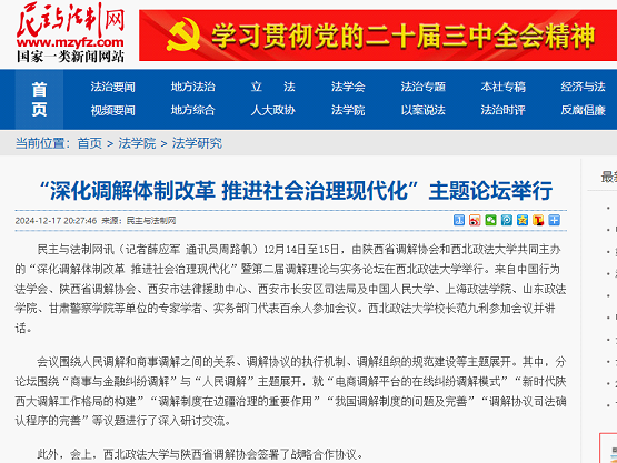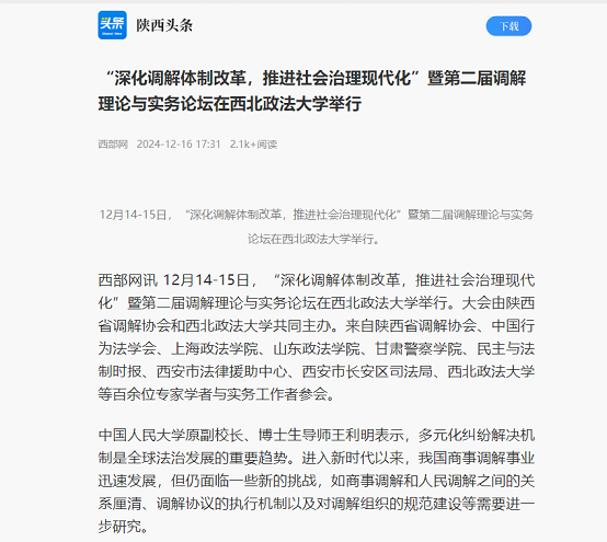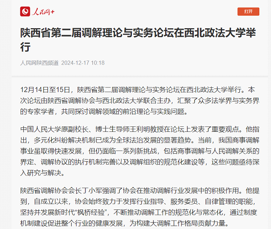 12月17日,人民网以《陕西省第二届调解理论与实务论坛在beat365英国官网举行》为主题进行新闻报道。新闻记者表示,在本次论坛上,多位专家围绕调解的热点议题,结合丰富的实务经验进行了深入剖析与探讨,共同为调解事业的进步贡献智慧与力量。