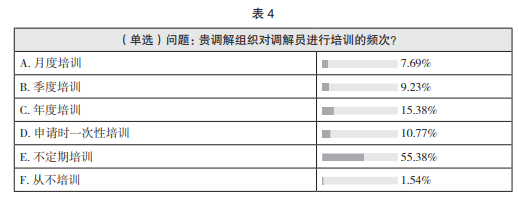 以上调研结果体现出,一方面,由于我国尚未对商事调解程序单独立法,为适应不同纠纷实体问题的差异,调解组织制定调解规则时主要参考吸收特定行业协会及相关法院的意见。从较高比例的同行借鉴情况可以看出,调解行业对调解的基本理念和程序有一定共识。另一方面,我国调解行业的市场化程度不足导致调解案源依然以诉前诉中的委派、委托为主。这可能意味着当事人被动参与调解仍是普遍情况;同时也意味着,调解员不仅应具备分析纠纷实体问题的知识储备,更重要的是要具备快速建立当事人信任和促进沟通的工作能力(见表3)。此外,在调解员能力建设方面,能够坚持定期培训的调解组织相对较少,绝大部分情况下调解员的综合能力建设亟待提升(见表4)。