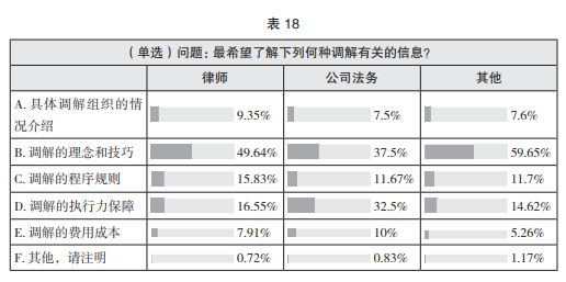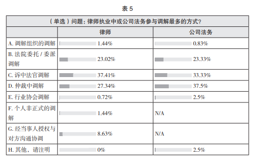针对律师和公司法务的调研主要涉及调解的认知度和具体实践情况。