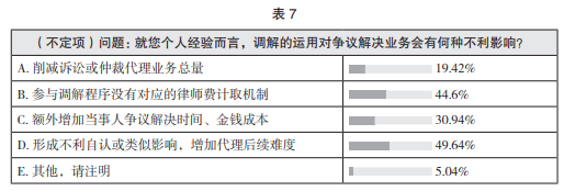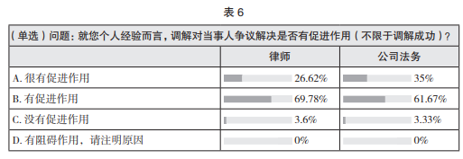 从调研情况看,无论是律师还是公司法务的反馈都印证了一个事实,即法院委派、委托仍是我国调解行业案件的主要来源。而且,在诉讼和仲裁程序中仍有进一步分流案源进入独立调解的潜力——诉讼和仲裁中由裁判者组织的调解数量仍远大于委派、委托调解的数量(见表5)。从现状看,绝大多数被调研对象对于调解的纠纷促进作用持肯定态度(见表6);从发展看,调解行业的市场化需要调解组织和调解员思考和探索其相对诉讼、仲裁裁判者而言,在组织和提供调解时可以提供的差异化服务为何。