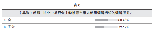 值得注意的是,就是否愿意主动参与调解,调研结果显示,律师群体普遍认为诉讼和仲裁中的调解存在几方面问题:即,存在影响裁判者心证形成的可能(49.64%)、参与调解的物质激励不足(44.6%),调解延宕了原本诉讼和仲裁程序的推进(30.94%)(见表7)。尽管如此,60.43%的律师表示在调解组织的独立调解服务可供选择的情况下,仍会主动推荐当事人使用该种调解服务(见表8)。