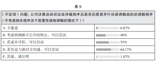 就调解组织的独立调解服务而言,公司法务群体普遍认为若能够通过调解有效搭建与相对方的沟通渠道(64.17%)、费用成本明确可控(55%),并遵从调解保密性原则(40%),诉讼或仲裁程序的存在并不妨碍公司决策尝试独立调解程序(见表9)。