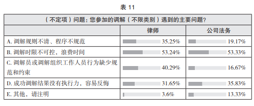 从实际参与调解程序的感受看,律师和公司法务两个群体的最大顾虑在于调解周期(包括法院委派、委托机制中的调解)不可控。实践中,诉讼和仲裁中的调解程序一旦开始,裁判者往往会搁置审理和裁判进程。许多从业者认为,裁判不确定性是施加调解决策压力的手段。但是,在越来越复杂的商事争议中,这种实践极易使得纠纷解决的时间成本失控(见表11)。