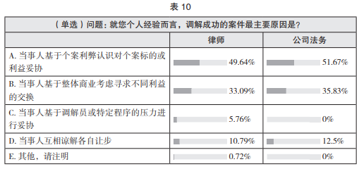 从以上调研结果看,市场化的独立调解服务在中国纠纷解决实践中存在切实的市场需求。该需求落地的关键在于调解组织和调解员稳定地提供有专业价值的调解服务。就专业化的调研结果来看,当下调解实践中大多数当事人是通过评估式调解认识个案利弊并达成妥协(见表10)。这意味着,一方面,调解员的评估不能过于偏离裁判的统一标准;另一方面,调解员协助当事人对不同的商业利益进行重组并打破零和博弈的能力有待提升——即采用促进式调解超越个案寻求双赢。笔者认为,只有足够专业的调解服务才具备市场化价值。调解员协助当事人明智决策是调解的核心价值。