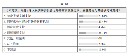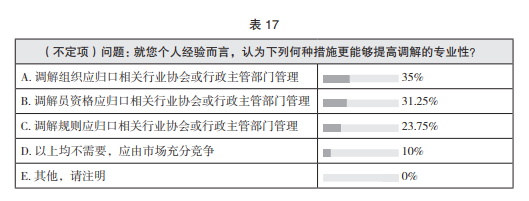 整体而言,从法官的视角出发,虽然诉源治理、繁简分流等工作是法院工作的重点,但绝大部分法官期待行业协会和行政主管部门就调解的管理和支持形成合力,多方努力共同保障我国调解事业基业长青(见表17)。